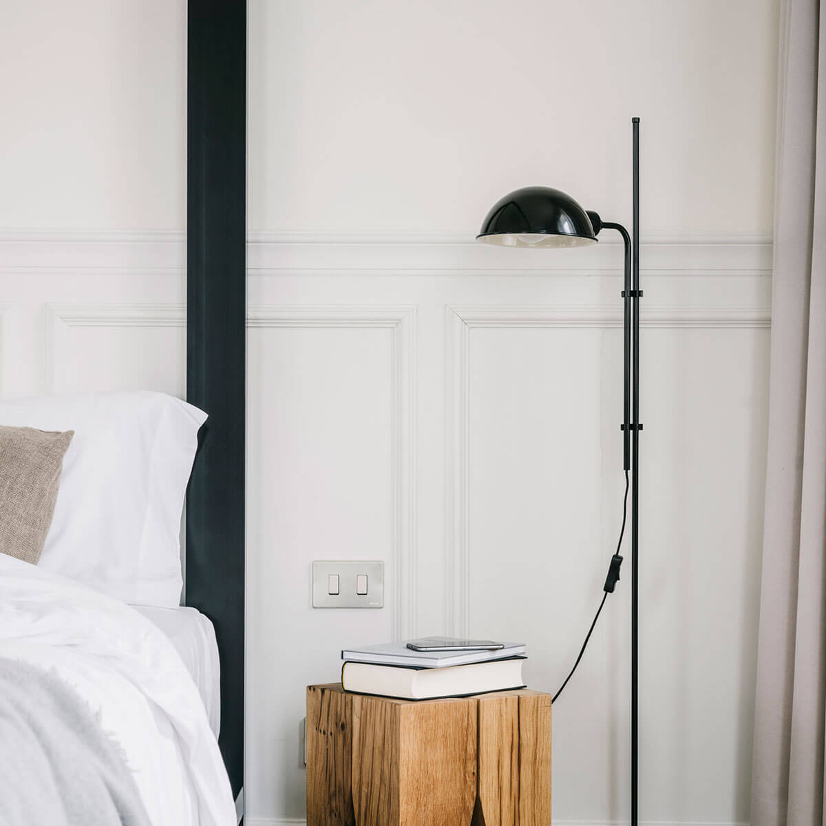 Ein besonderer Vorteil des Produkts: Mit ihrer grazilen Linie beansprucht die Marset Funiculí nur wenig Raum. Zudem kann sie sowohl für die direkte wie auch indirekte Beleuchtung eingesetzt werden – je nachdem, in welche Richtung der Leuchtenschirm ausgerichtet wird. Damit der Lichtkegel um bis zu 360° gedreht werden kann, wurde der Schirm von allem Unnötigen befreit. Als schlichte Kuppel ausgeführt, lässt er sich nach Belieben wenden, um Lektüre oder Arbeitsfläche punktgenau zu beleuchten.