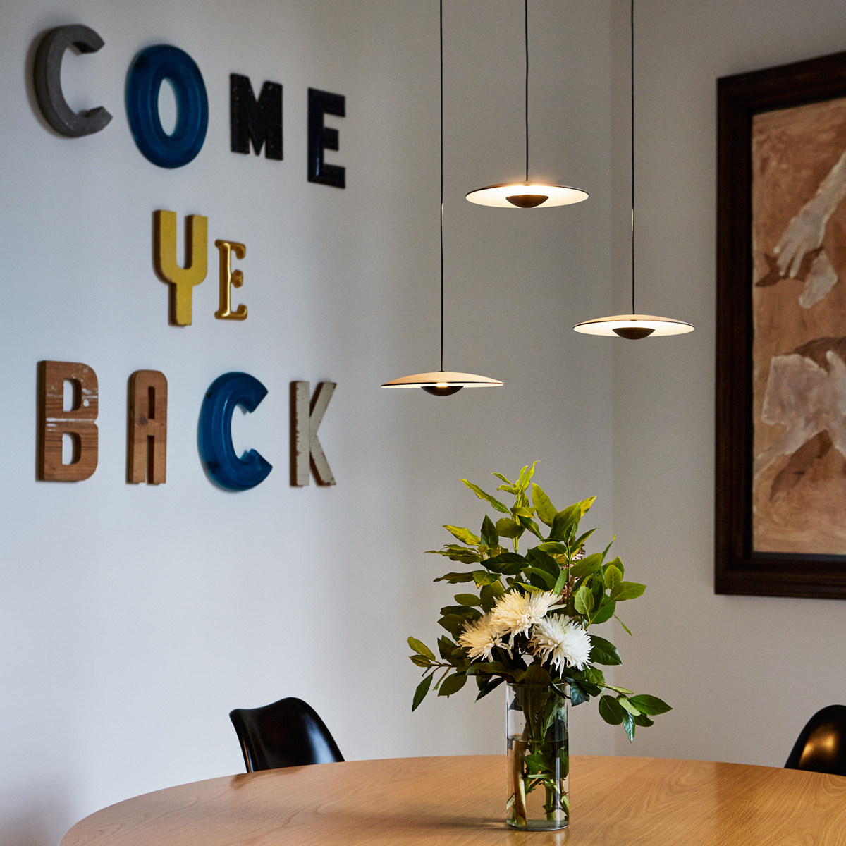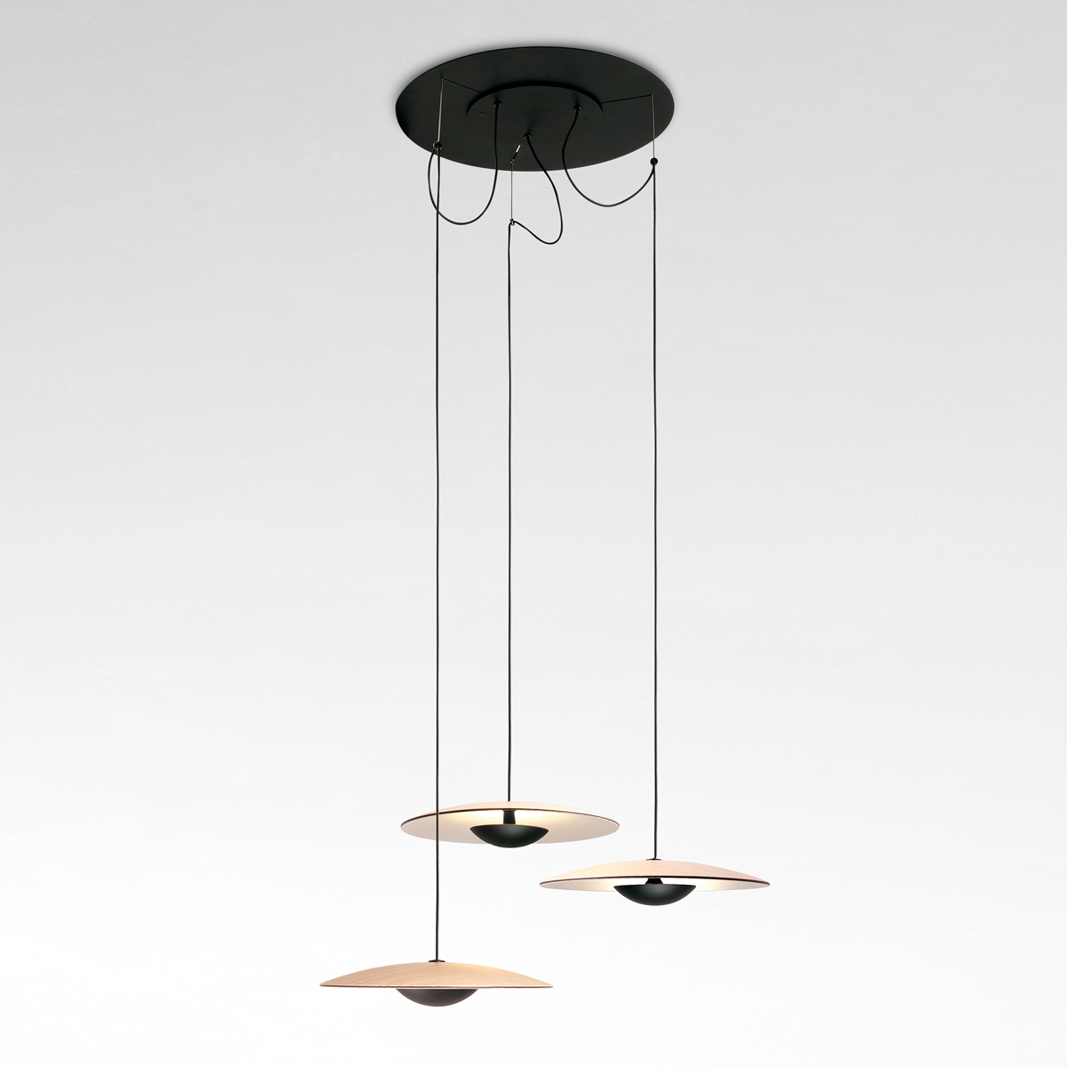 - Dreiflammige Pendelleuchte mit individuell abhängbaren Schirmen aus dünnem Schichtholz