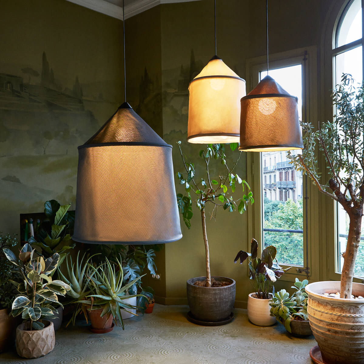 - Runde Außenpendellampe mit farbigem Textilschirm