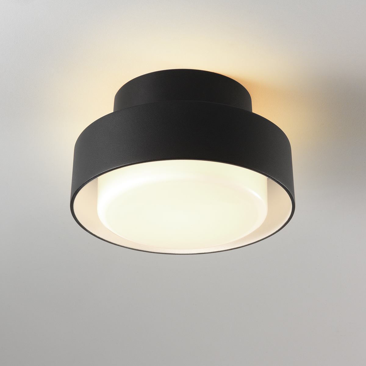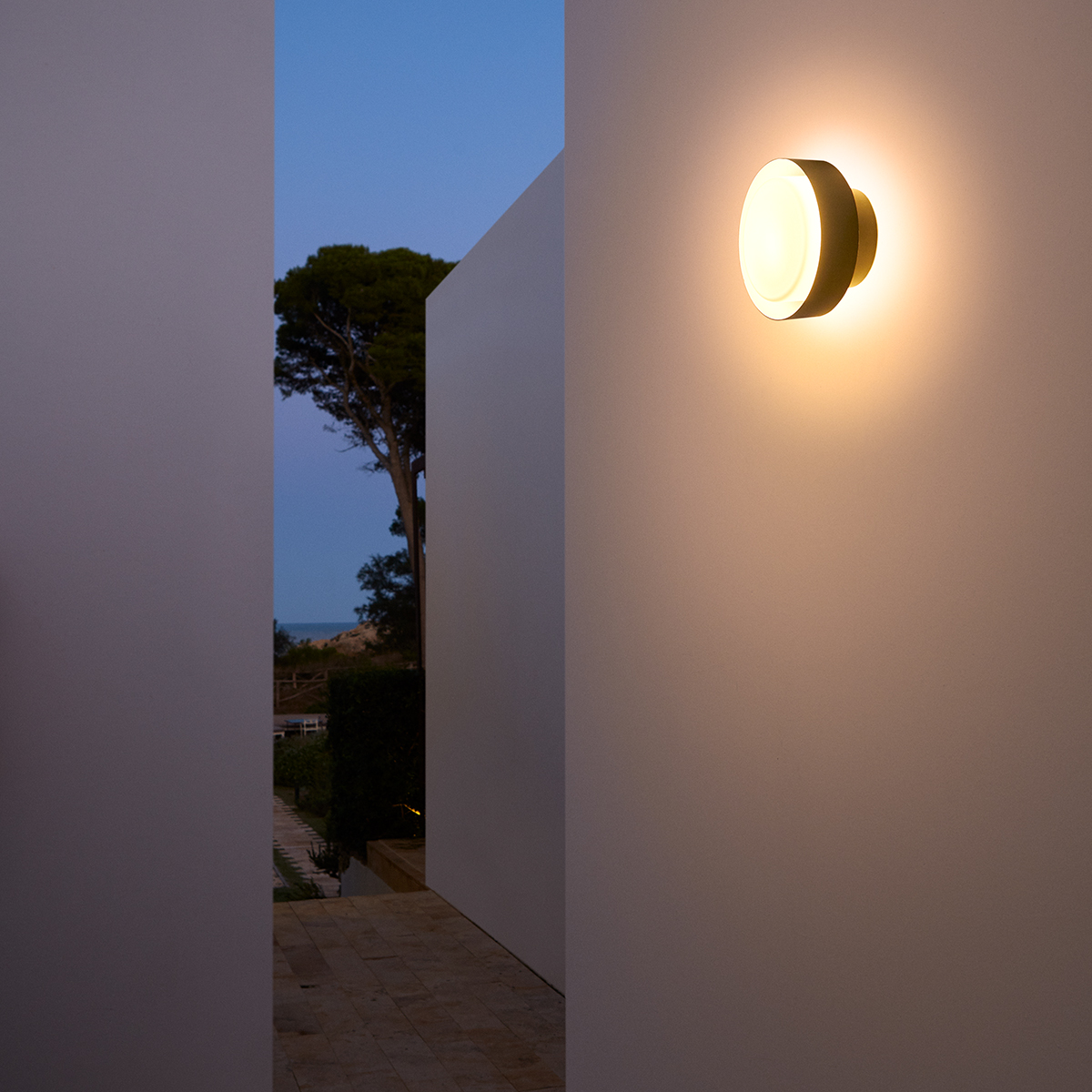 Kennzeichnendes Merkmal der Leuchte ist der Diffusor aus mundgeblasenem weißem Glas, der so konzipiert ist, dass er scheinbar losgelöst vom Umfassungsring schwebt. Dieses Designelement ermöglicht ein diffuses, nach unten gerichtetes Licht, das einen ansprechenden Lichthof erzeugt, während ein dezentes Akzentlicht dekorativ nach oben strahlt. Das Ergebnis ist eine angenehme und einladende Atmosphäre im Freien.