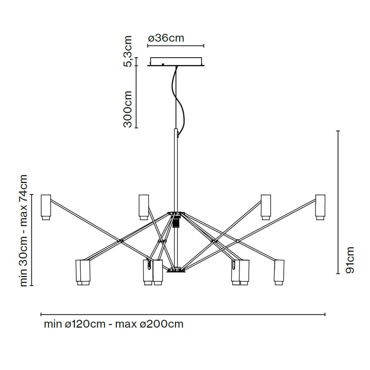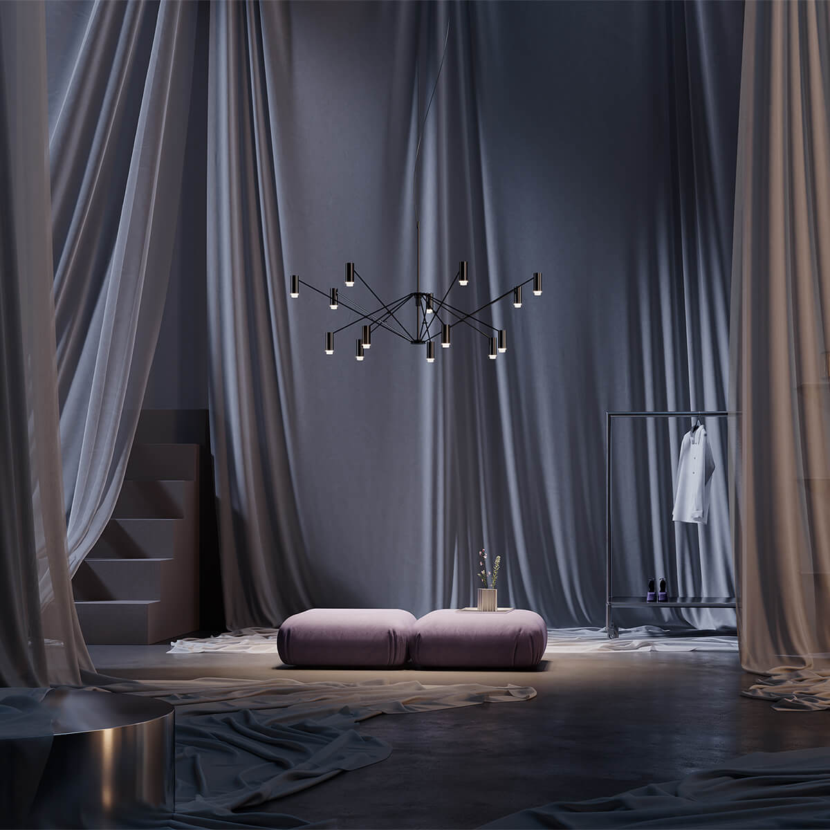 Die gleichmäßige, nach unten gerichtete Lichtverteilung verdankt sich den zylindrischen Strahlern, die an den Endpunkten der schwarzen Streben angeordnet sind und die LED-Leuchtmittel tragen. Als dekoratives Detail sind sie mit Innenringen in den Farben Gold, Elfenbein und Terrakotta versehen, die, wenn die Pendelleuchte eingeschaltet ist, das Licht reflektieren.