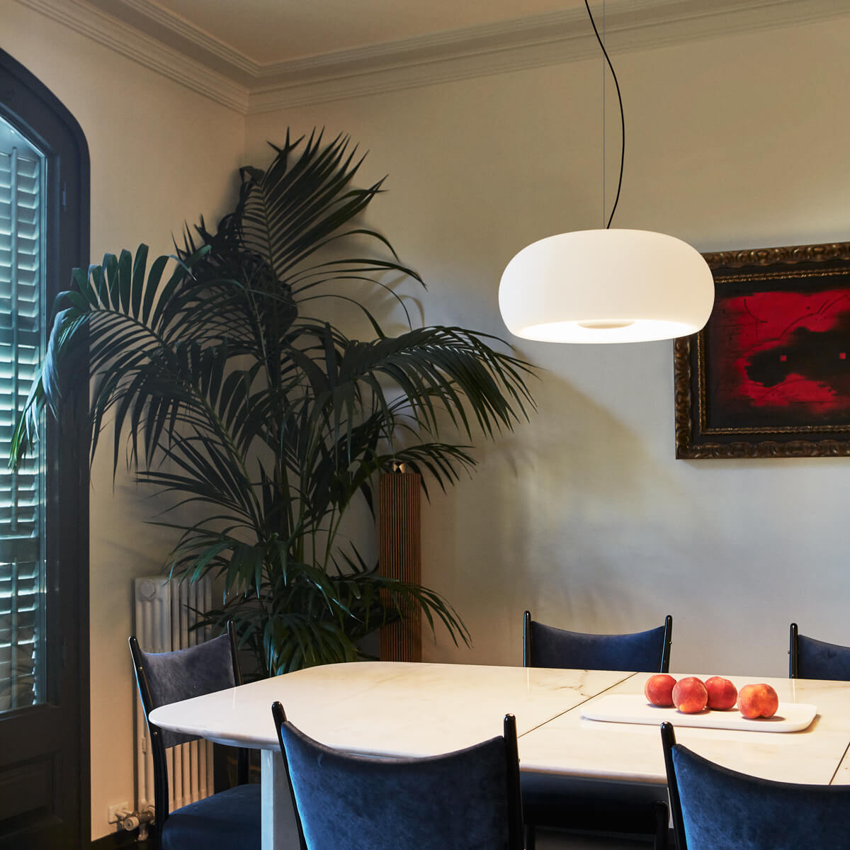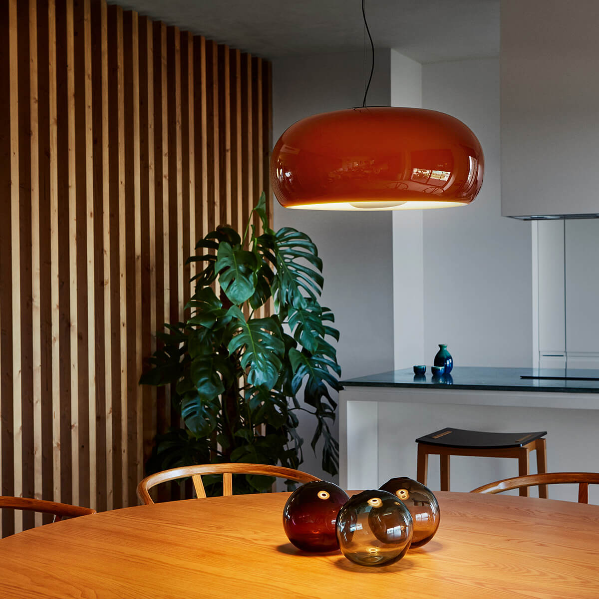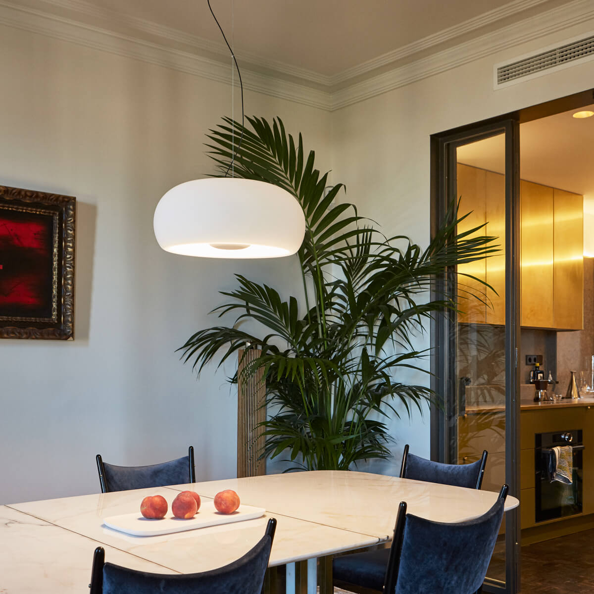 - Schönlinige Pendellampe mit geblasenem Kristallglasschirm