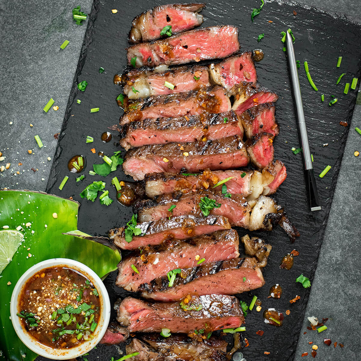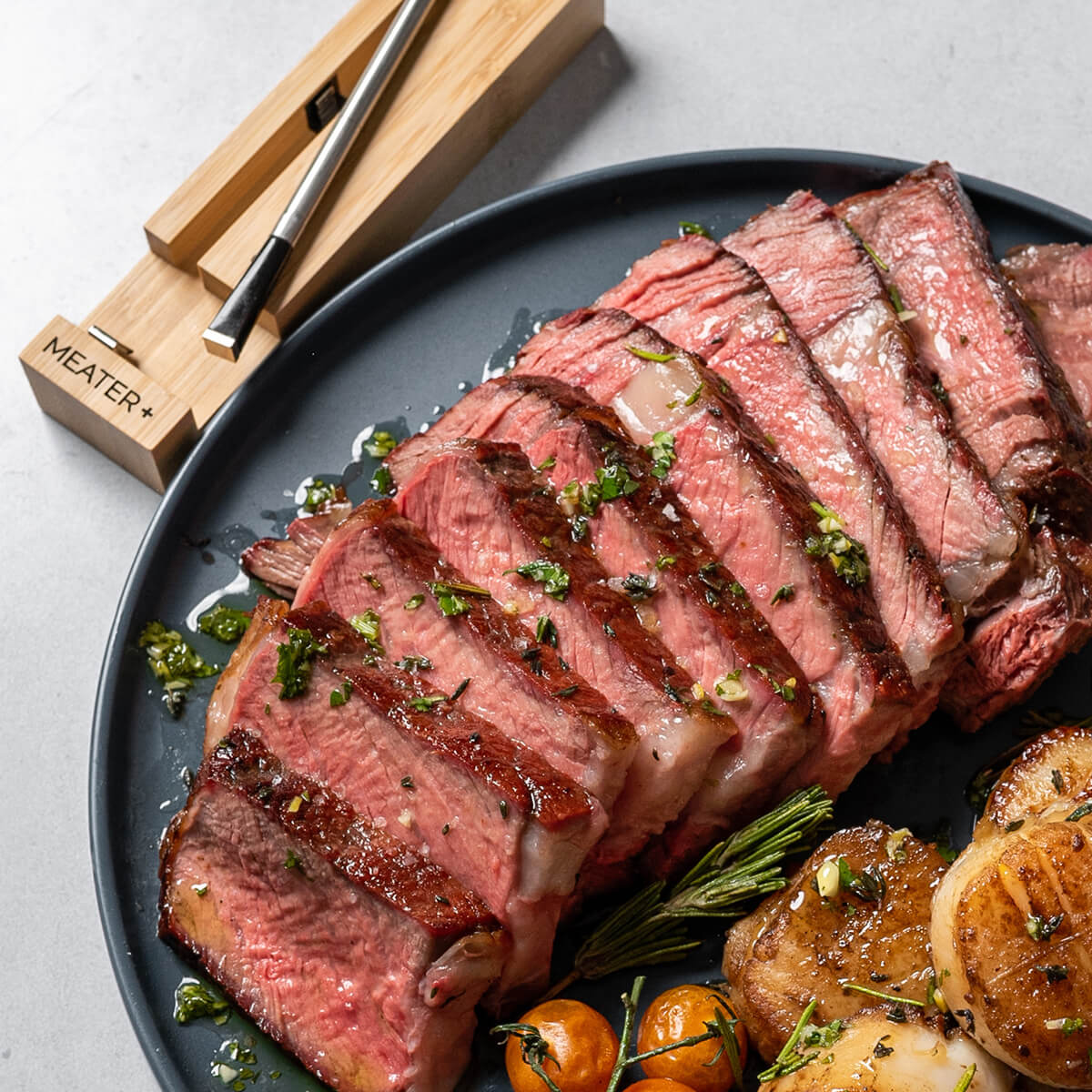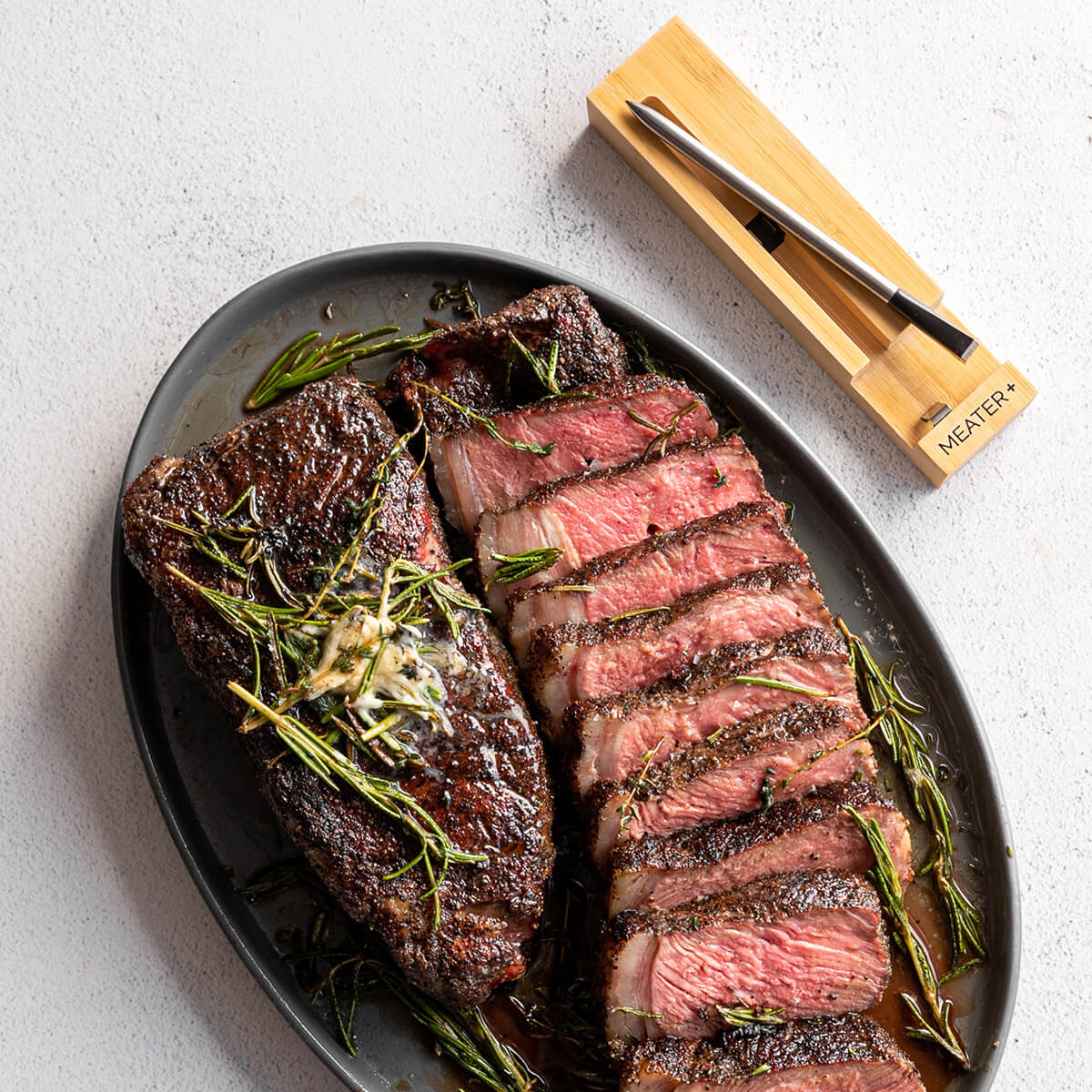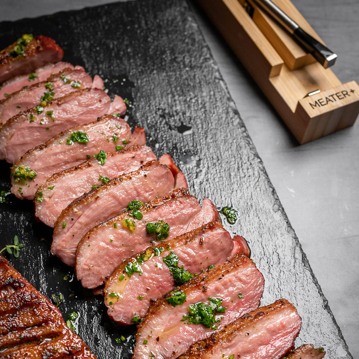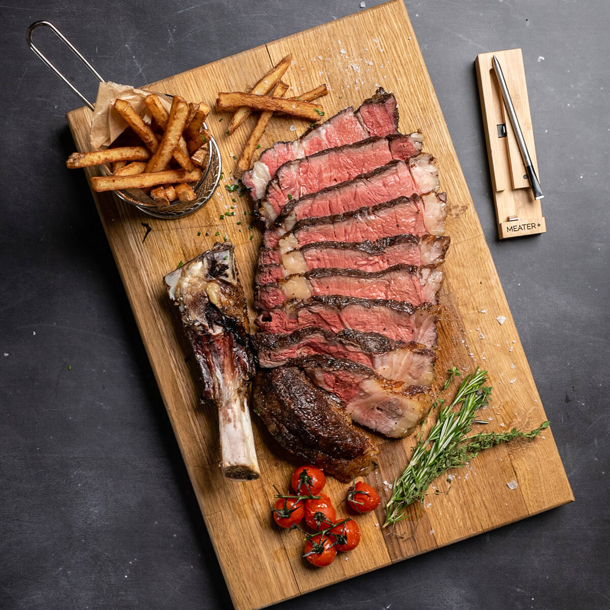 Wie MEATER Plus funktioniert? Einfach den Temperaturfühler in das Gargut stecken, Fleischsorte und gewünschten Garzustand in der Meater App auswählen und den Garprozess starten. Der innovative Algorithmus berechnet Gar- und Ruhezeiten und hält Sie über den Fortschritt des Garvorgangs auf dem Laufenden. So können Sie sich entspannt zurücklehnen, während Steak, Hähnchen und Fisch auf den Punkt genau gegart werden.