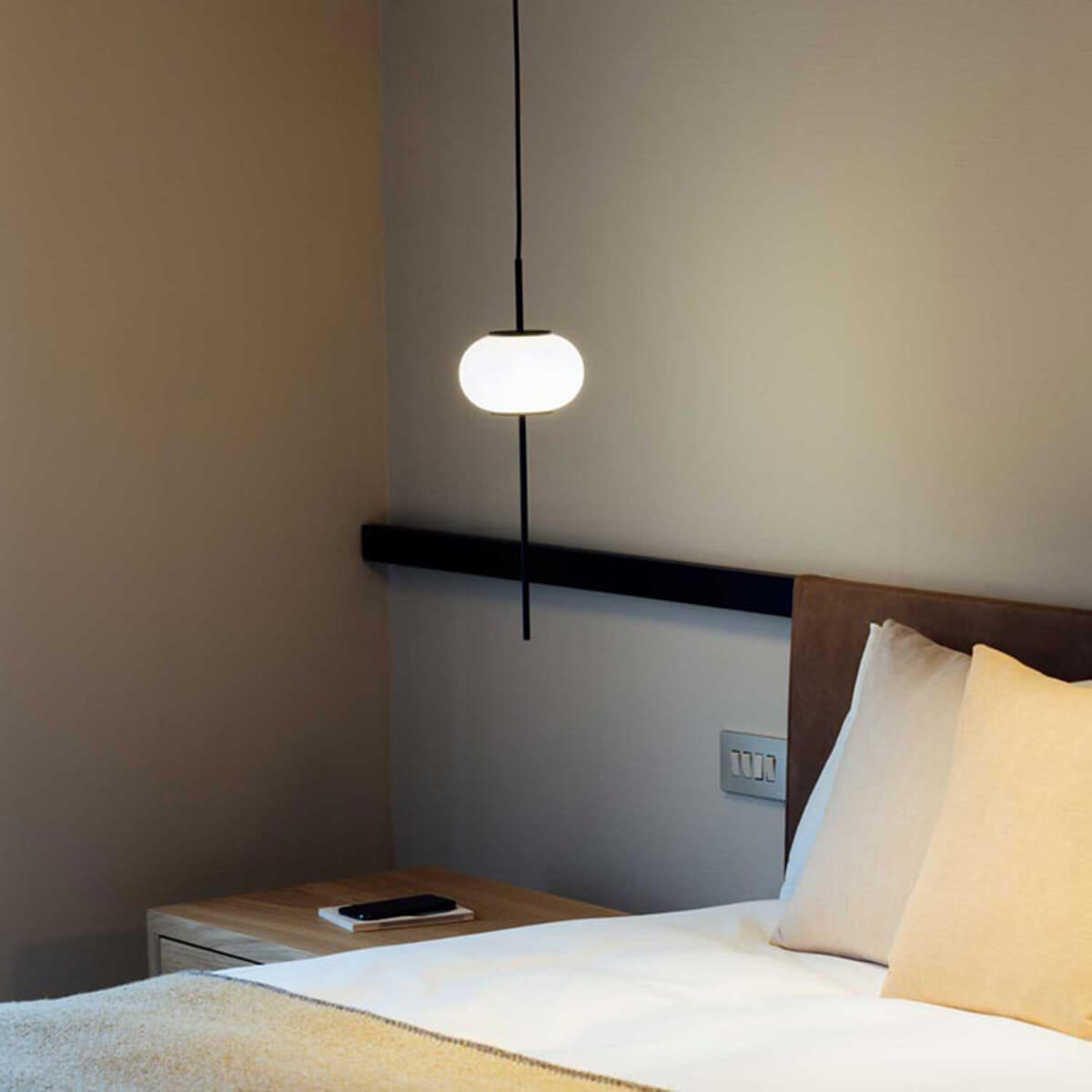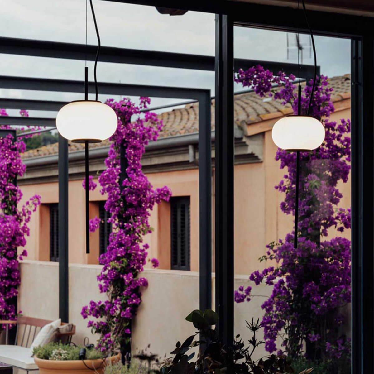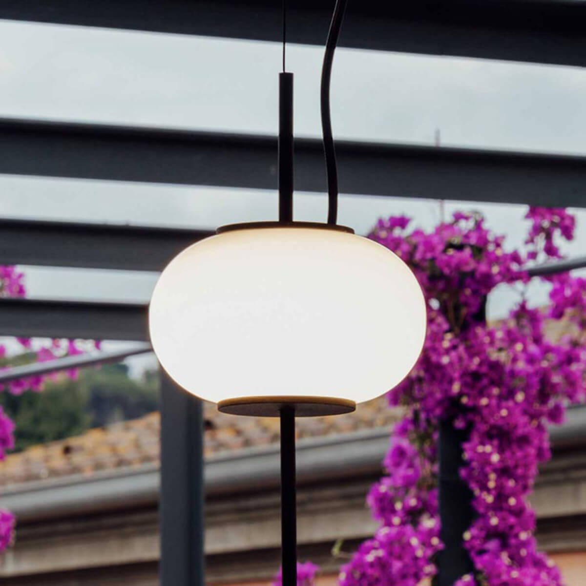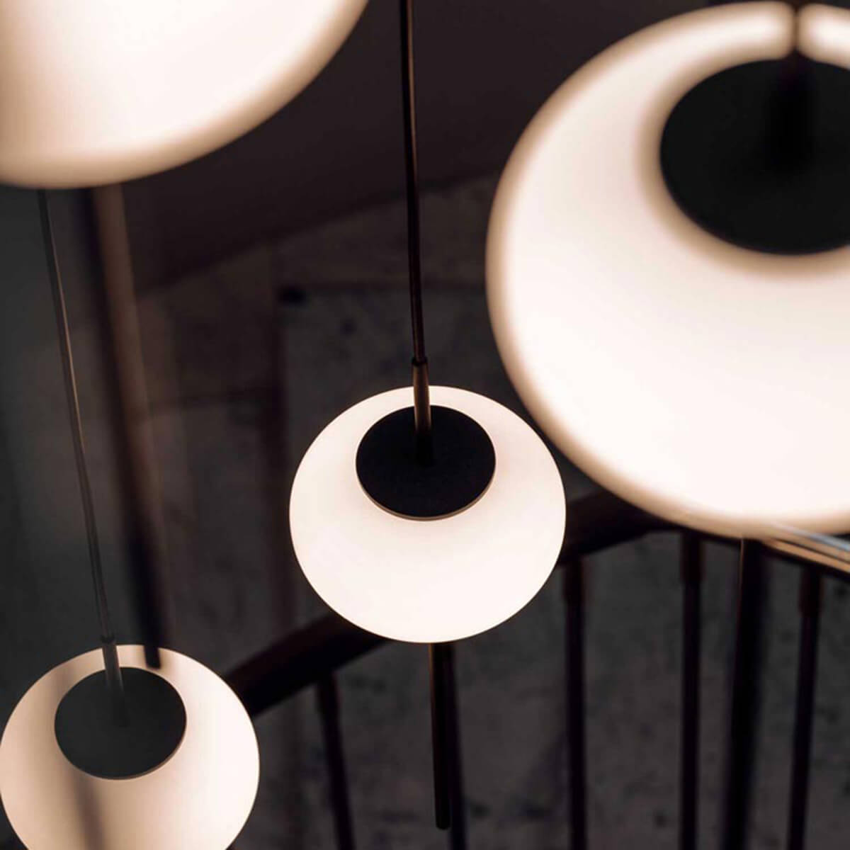 Filigrane Leuchte in schwarz matter Oberfläche mit einem runden Opalglas Diffusor, die Astros Pendelleuchte ist höhenverstellbar und erhältlich in zwei Größen. Die Pendelleuchte mit einer Pendellänge von max. 300 cm ist vorkonfiguriert und wird mit einem einfachen Baldachin und einem Pendel angeboten. Auf Anfrage sind mehrflammige Leuchten aus 2, 3, 4, 5, oder bis zu 6 Pendel möglich.