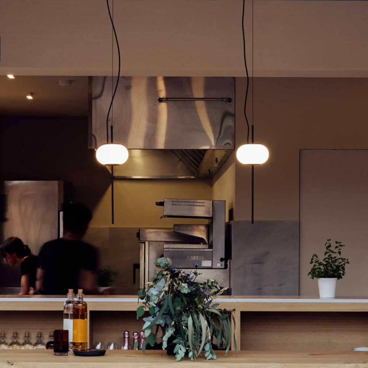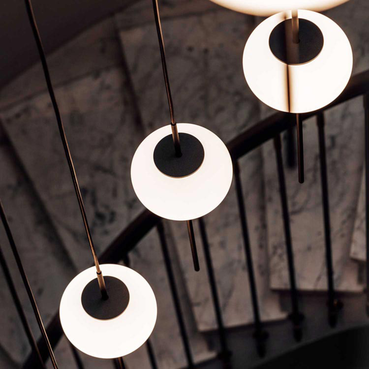 Milan Astros Pendelleuchte, schwarz matt, die Abbildung zeigt mehrere Leuchten in versch. Höhen nebeneinander montiert