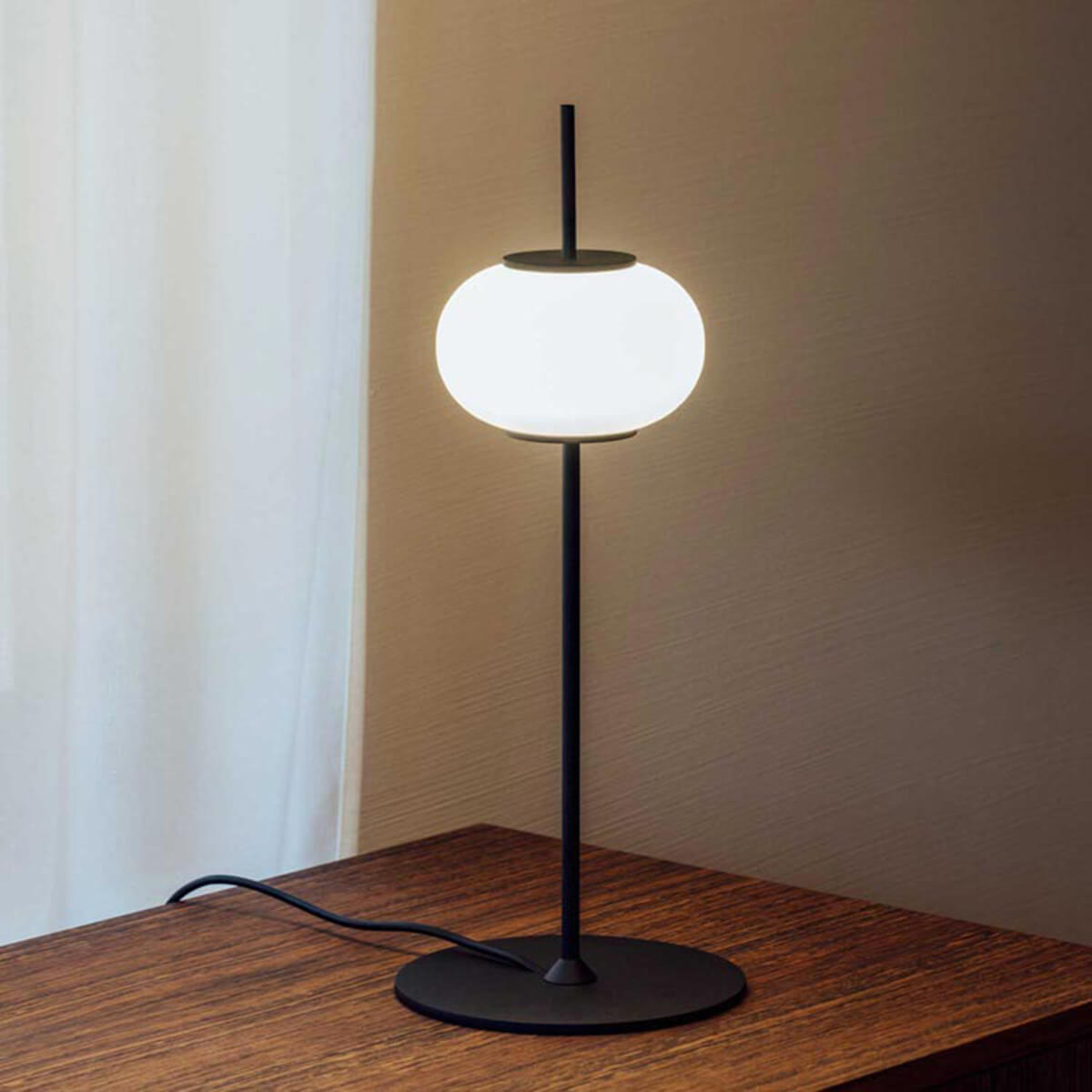 Filigrane Leuchte in schwarz matter Oberfläche mit einem runden Opalglas Diffusor, die Astros Tischleuchte ist eine schöne Ergänzung zu der gesamten Astros Kollektion, bestehend aus Steh- und Pendelleuchten.