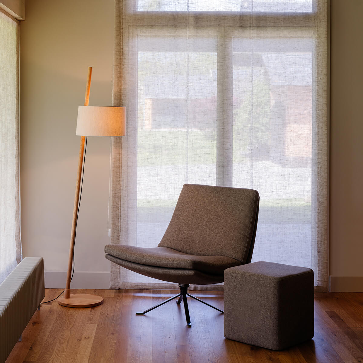 Die Linood mit geneigtem Gestell von Milan ist eine schöne Stehleuchte aus naturbelassenen Materialien, fügt sich in fast alle Wohnbereiche gut ein und sorgt für Wohlfühlatmosphäre.