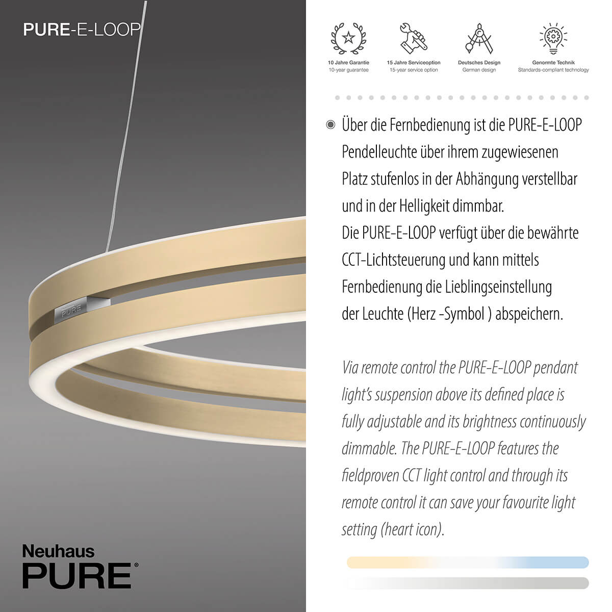 Die Designerlampe PURE E-Loop überzeugt nicht nur durch ihre stilvolle Erscheinung, sondern auch durch ihre herausragende Qualität. Gefertigt aus edlen Materialien und ausgestattet mit neuester LED-Technologie, bietet sie eine langlebige und energieeffiziente Beleuchtungslösung. Für maximale Sicherheit und Vertrauen gewährt Paul Neuhaus eine großzügige 10-jährige Garantie.