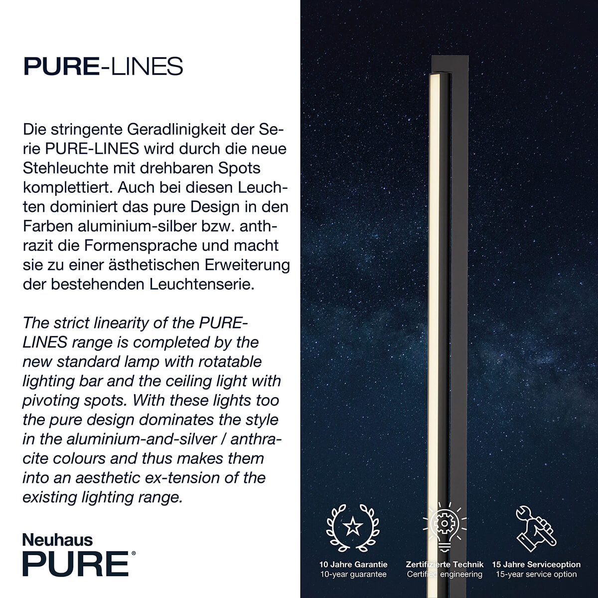 Die PURE-Floor von Paul Neuhaus steht für höchste Qualität und Beständigkeit, unterstützt durch eine exklusive 10 Jahre Neuhaus PURE Garantie. Erleben Sie die perfekte Kombination aus modernster Technik und ansprechendem Design mit der PURE Lines Floor LED Stehleuchte.