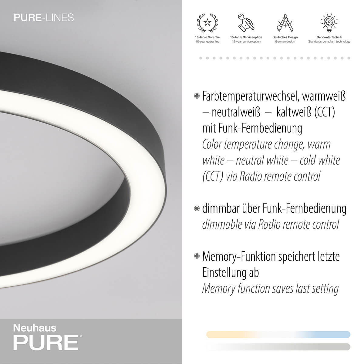 Die Pure Lines LED Deckenleuchte besticht durch ihr puristisches Design und ihre hochwertige Verarbeitung. Hergestellt aus erstklassigen Materialien und präzise gefertigt, steht diese Leuchte für Qualität und Langlebigkeit - garantiert durch die 10 Jahre Paul Neuhaus Garantie. Beleuchten Sie Ihr Zuhause stilvoll und flexibel mit der PURE Lines LED Deckenleuchte.