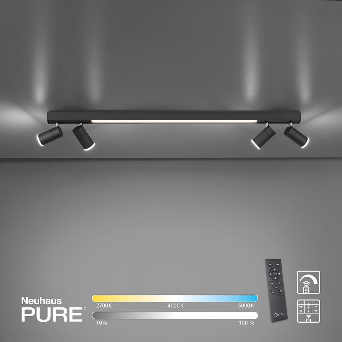 Die Deckenlampe PURE-Spot bietet Ihnen stufenlose CCT-Lichtsteuerung von warmweiß (2.700 K) bis tageslichtweiß (5.000 K) und lässt sich über die mitgelieferte Funk-Fernbedienung bequem dimmen. Die Spots und die Lichtleiste sind getrennt steuerbar, was Ihnen maximale Flexibilität ermöglicht. Dank der integrierten Memory-Funktion merkt sich die Leuchte Ihre bevorzugten Einstellungen und stellt diese beim nächsten Einschalten wieder her.