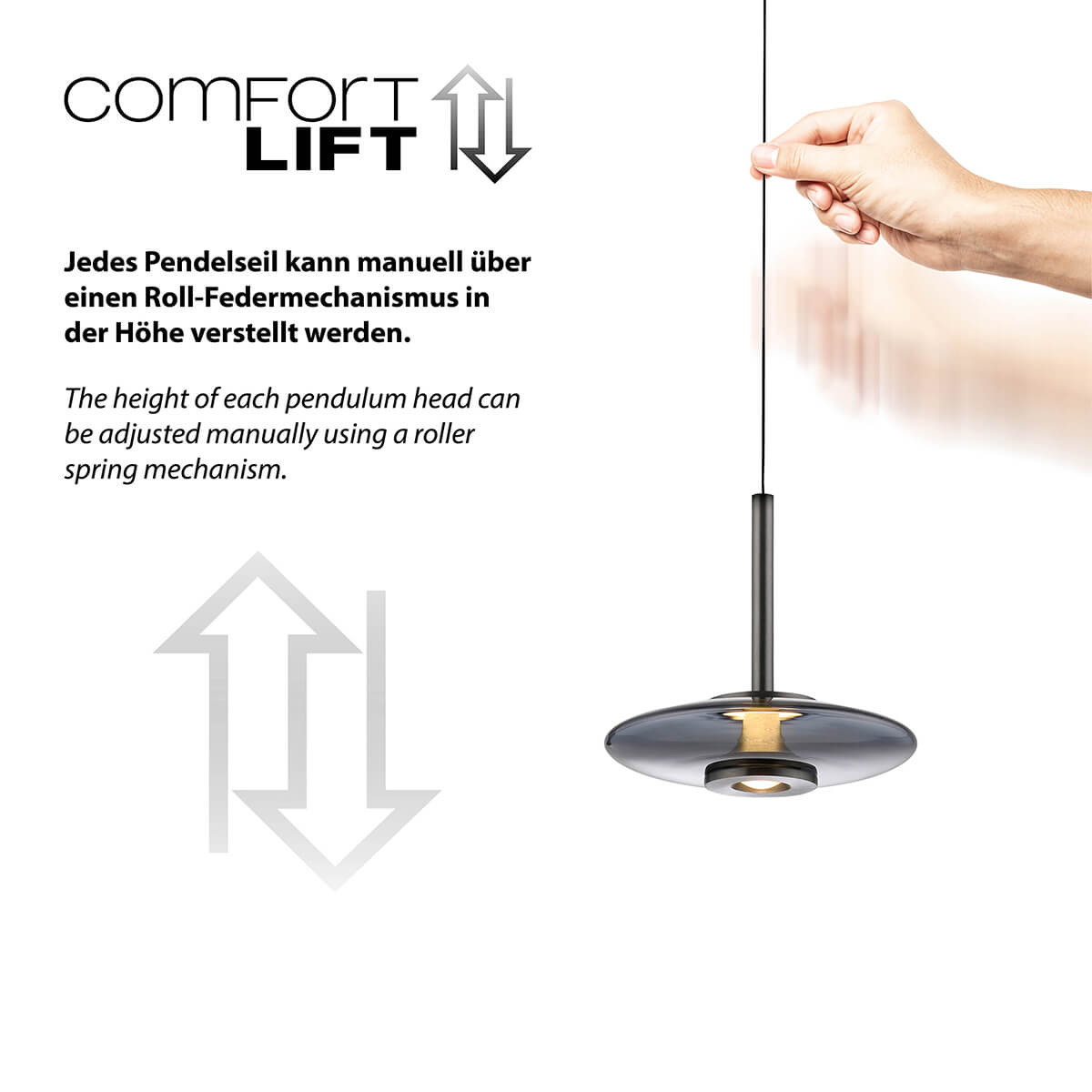Besonders praktisch: Die integrierte Comfort-Lift-Funktion ermöglicht eine mühelose Höhenverstellung. Dank der raffinierten Mechanik im Baldachin gehören störende Gegengewichte der Vergangenheit an. So lässt sich die Leuchte ganz einfach auf die gewünschte Höhe einstellen - schnell, flexibel und komfortabel per Handgriff.