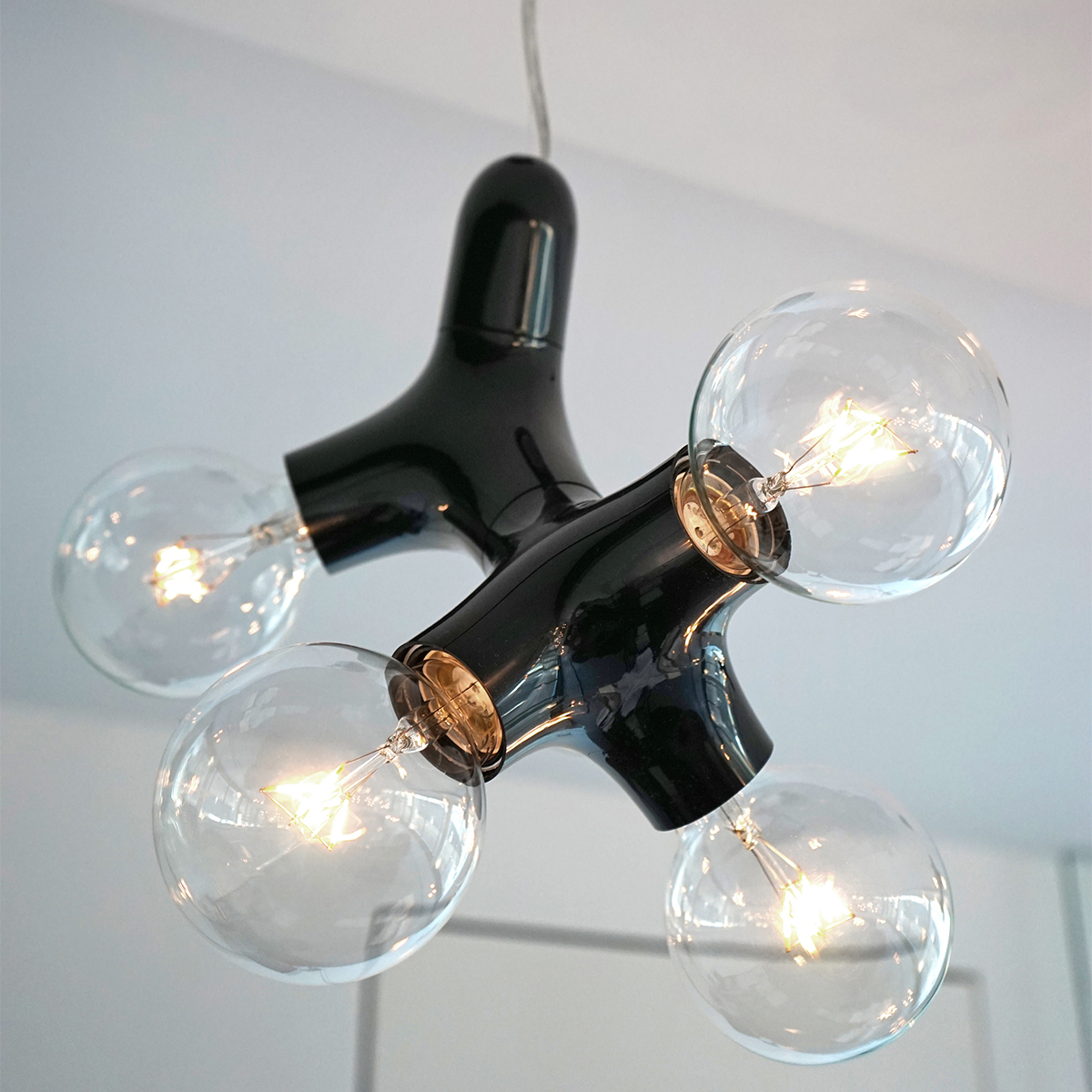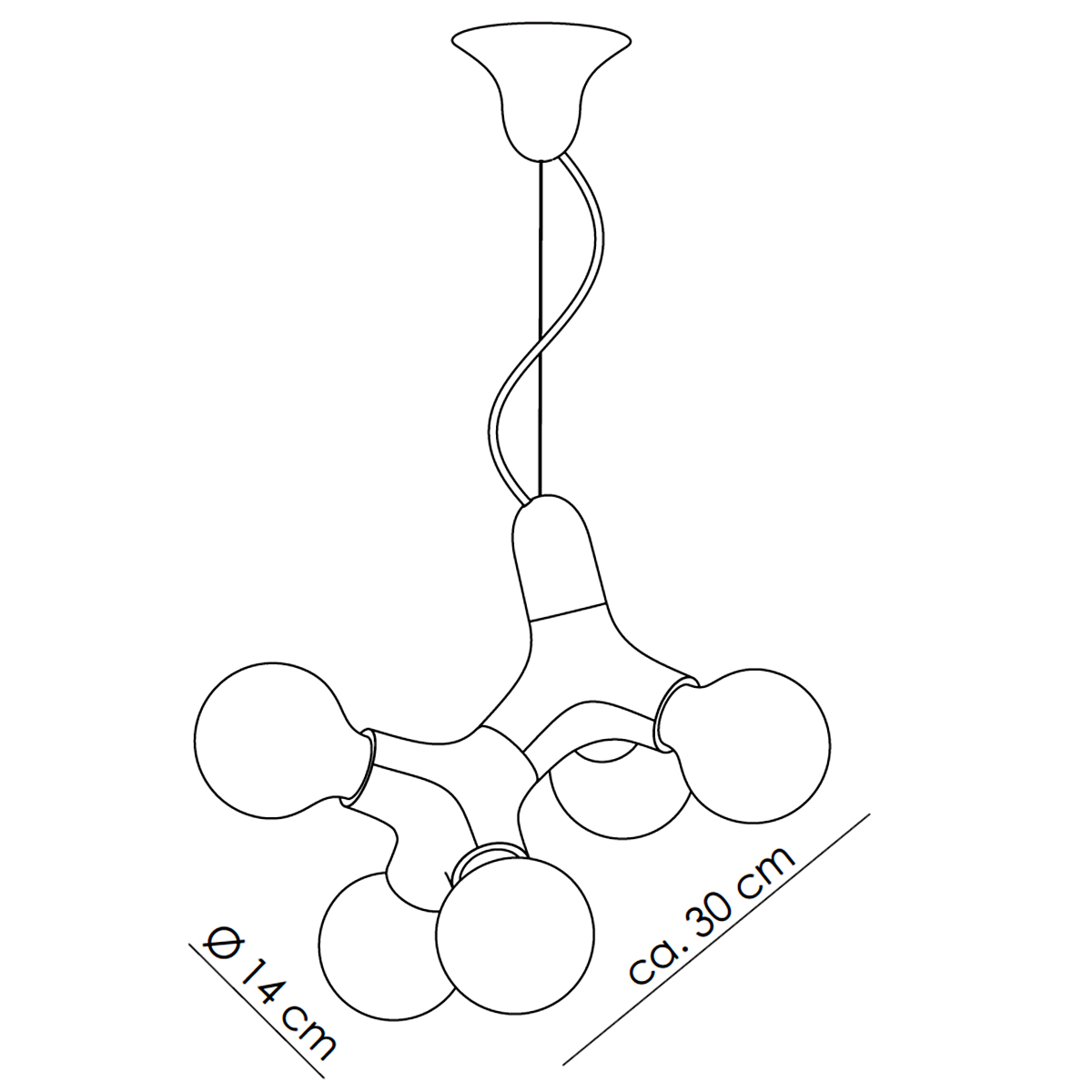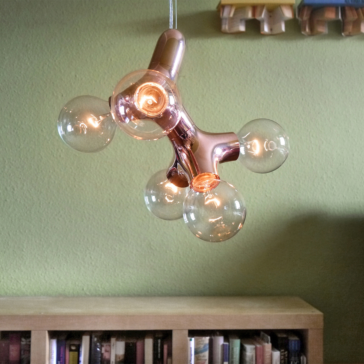 Die originelle Form der DNA Double Pendelleuchte verdankt sich nicht zuletzt den globeförmigen Leuchtmitteln, mit denen die Leuchte bestückt wird. Bitte beachten Sie, dass diese nicht im Lieferumfang inbegriffen sind. Je nach gewünschtem Lichteffekt empfehlen sich opale, klare oder streifenverspiegelte LED-Globelampen.