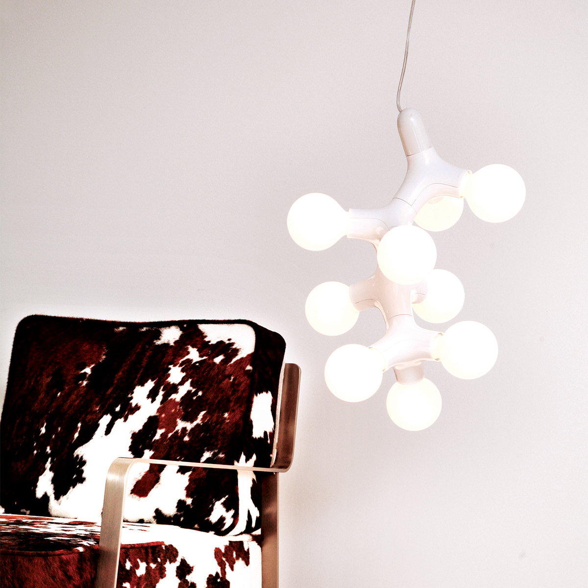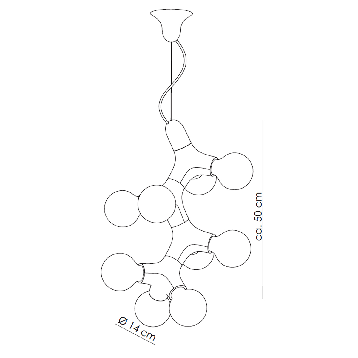 Die originelle Form der DNA Quattro Pendelleuchte verdankt sich nicht zuletzt den globeförmigen Leuchtmitteln, mit denen die Lampe bestückt werden muss. Bitte beachten Sie, dass diese nicht im Lieferumfang inbegriffen sind. Je nach gewünschtem Lichteffekt empfehlen sich opale, klare oder streifenverspiegelte LED-Globelampen.