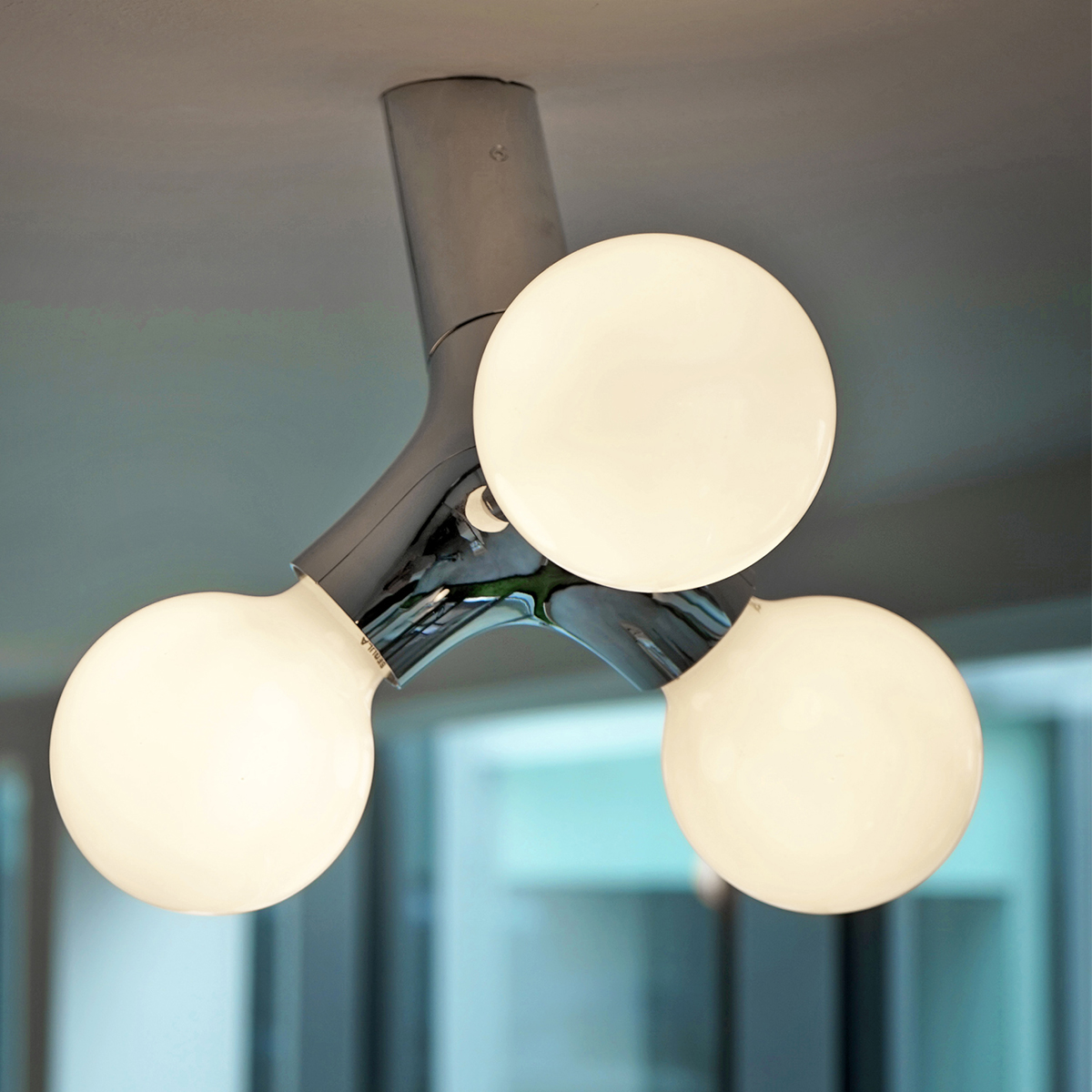 Die originelle Form der DNA Single 3 Wand- / Deckenleuchte verdankt sich nicht zuletzt den globeförmigen Leuchtmitteln, mit denen die Lampe bestückt werden muss. Bitte beachten Sie, dass diese nicht inbegriffen sind. Je nach gewünschtem Lichteffekt empfehlen sich opale, klare oder streifenverspiegelte LED-Globelampen.