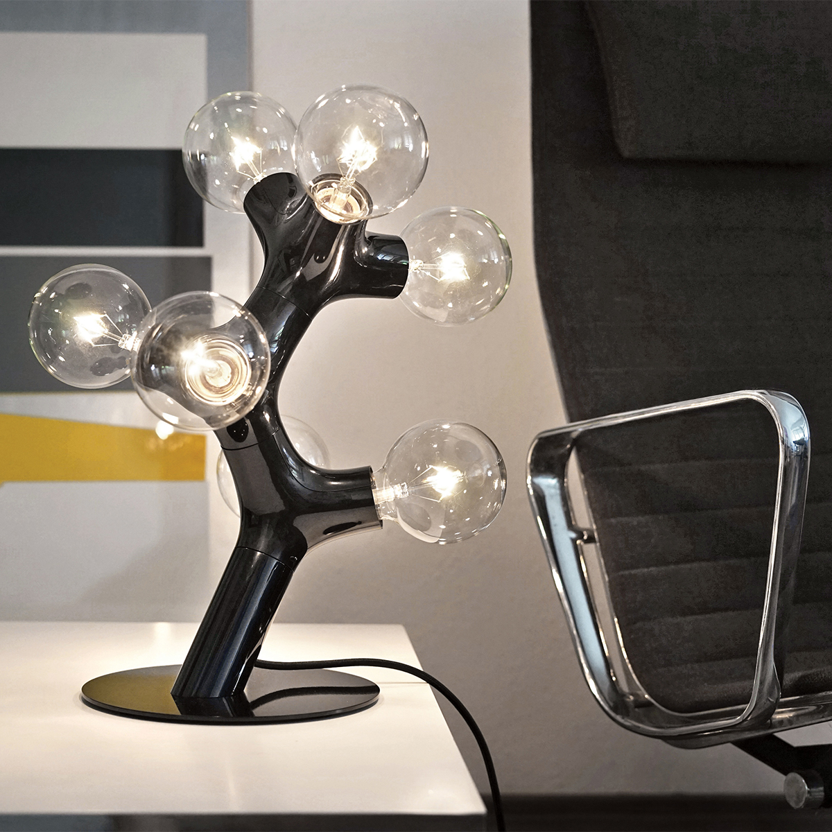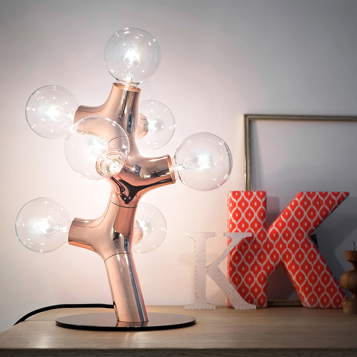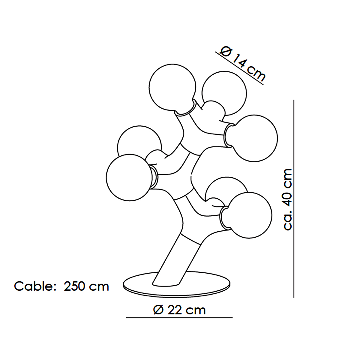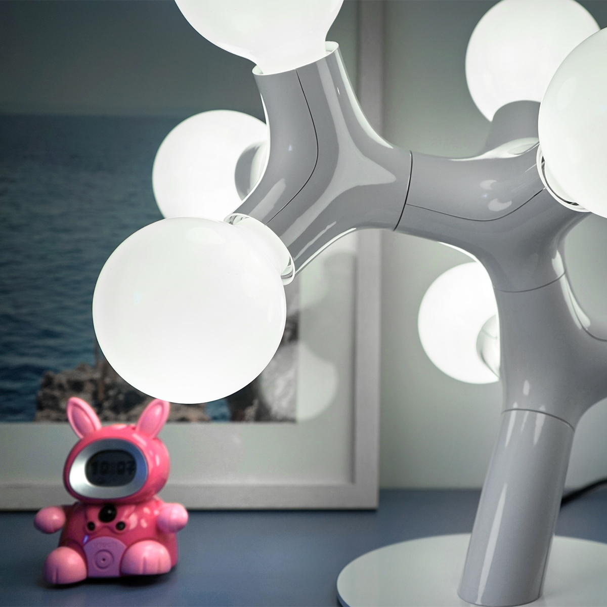 Die originelle Form der DNA Tischleuchte verdankt sich nicht zuletzt den globeförmigen Leuchtmitteln, mit denen die Lampe bestückt werden muss. Bitte beachten Sie, dass diese nicht im Lieferumfang inbegriffen sind. Je nach gewünschtem Lichteffekt empfehlen sich opale, klare oder streifenverspiegelte LED-Globelampen.