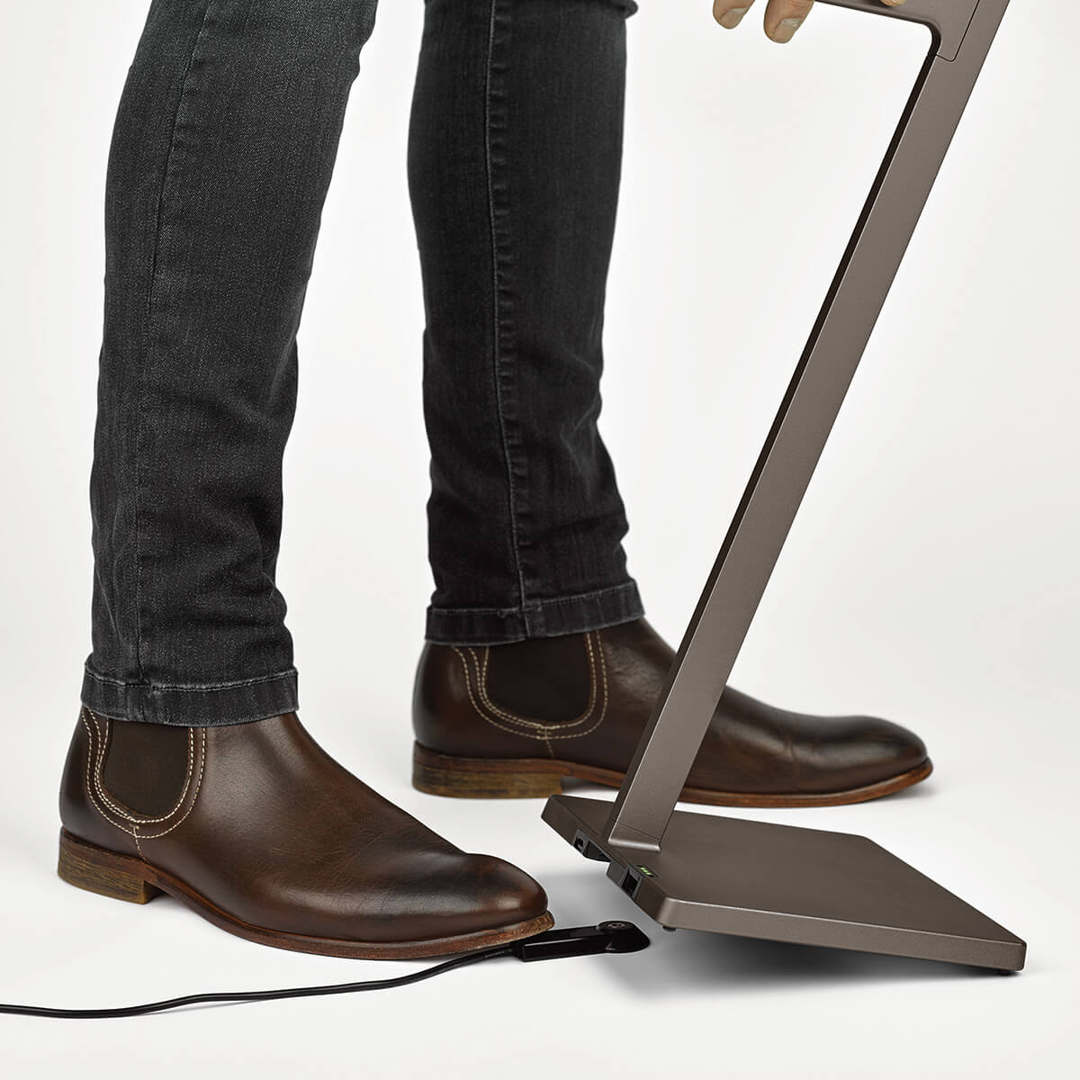 Noch einfacher gestaltet es sich mit dem beiliegenden magnetischen Ladepuck, dem Magnetic Dock: Führen Sie den Ladepuck an die hierfür vorgesehene Andockstation im Sockel heran, bis der Puck mit einem hörbaren Klacken einrastet. Soll die Stehlampe wieder vom Stromnetz getrennt werden, genügt es, den Ladepuck mit der Fußspitze sanft anzutippen, um die Verbindung zu lösen. Lästiges Bücken nach dem Stromkabel gehört damit der Vergangenheit an!