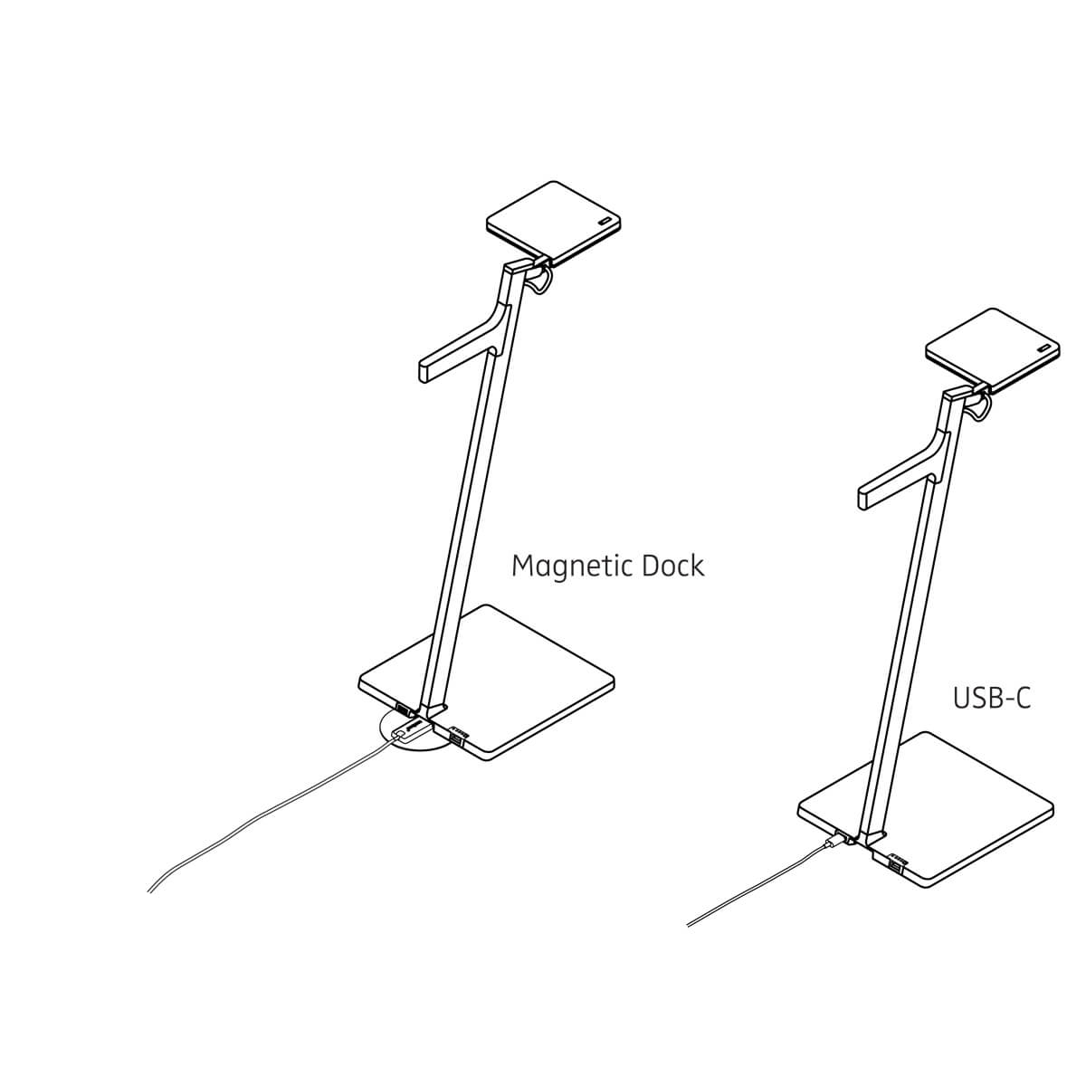 Nähert sich die Akkulaufzeit dem Ende, kann die Tischlampe über das beiliegende Zubehör, das USB-C-Ladekabel oder das Magnetic Dock, wieder aufgeladen werden. Als besonders komfortabel erweist sich hierbei die Verwendung des Magnetic Docks, eines magnetischen Ladepucks, der sich magnetisch an den Leuchtensockel andocken lässt – kinderleicht und unkompliziert. Im Gegensatz zur Nutzung des USB-C-Anschlusses kann die Nimbus Roxxane Leggera 52 CL bei Aufladung via Magnetic Dock eingeschaltet bleiben.