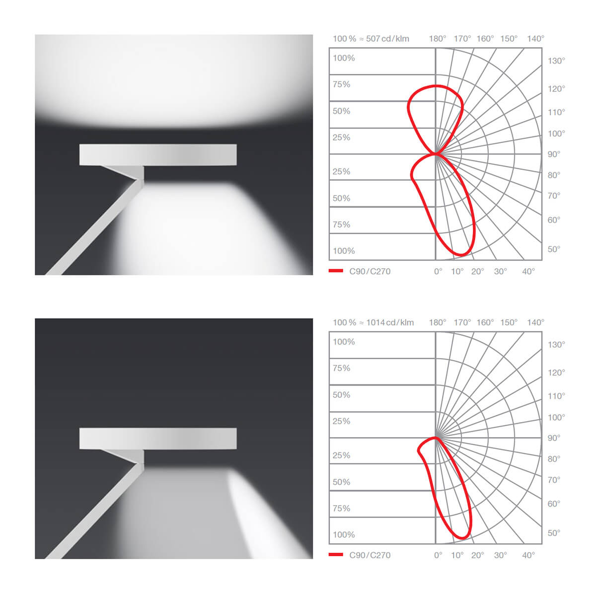 - Breit abstrahlendes Indirektlicht und gerichtetes, asymmetrisches Direktlicht