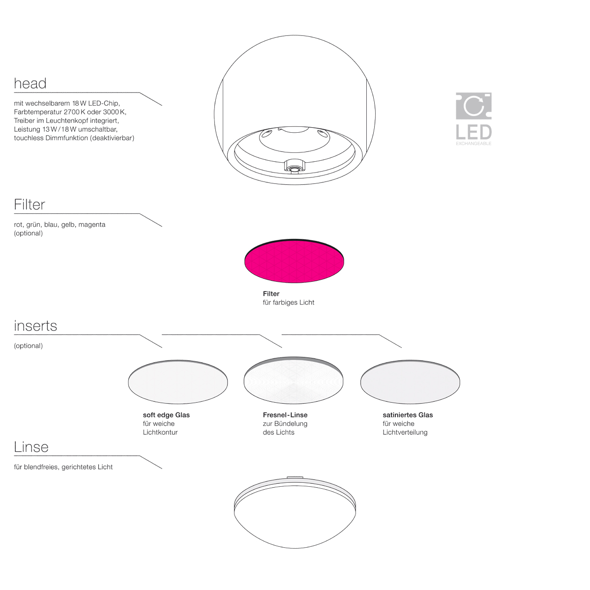 Ihnen ist Ihre io 3d Leuchte noch zu langweilig? Kombinieren Sie den io 3d C Leuchtenkopf mit zusätzlichen Inserts und variieren Sie den generierten Lichteffekt! Mithilfe der Fresnellinse bündeln Sie das Licht und erzeugen einen Abstrahlwinkel von ca. 60°. Dies macht die io 3d Leuchten perfekt zur gezielten Beleuchtung von Ausstellungsstücken und Raumbereichen.