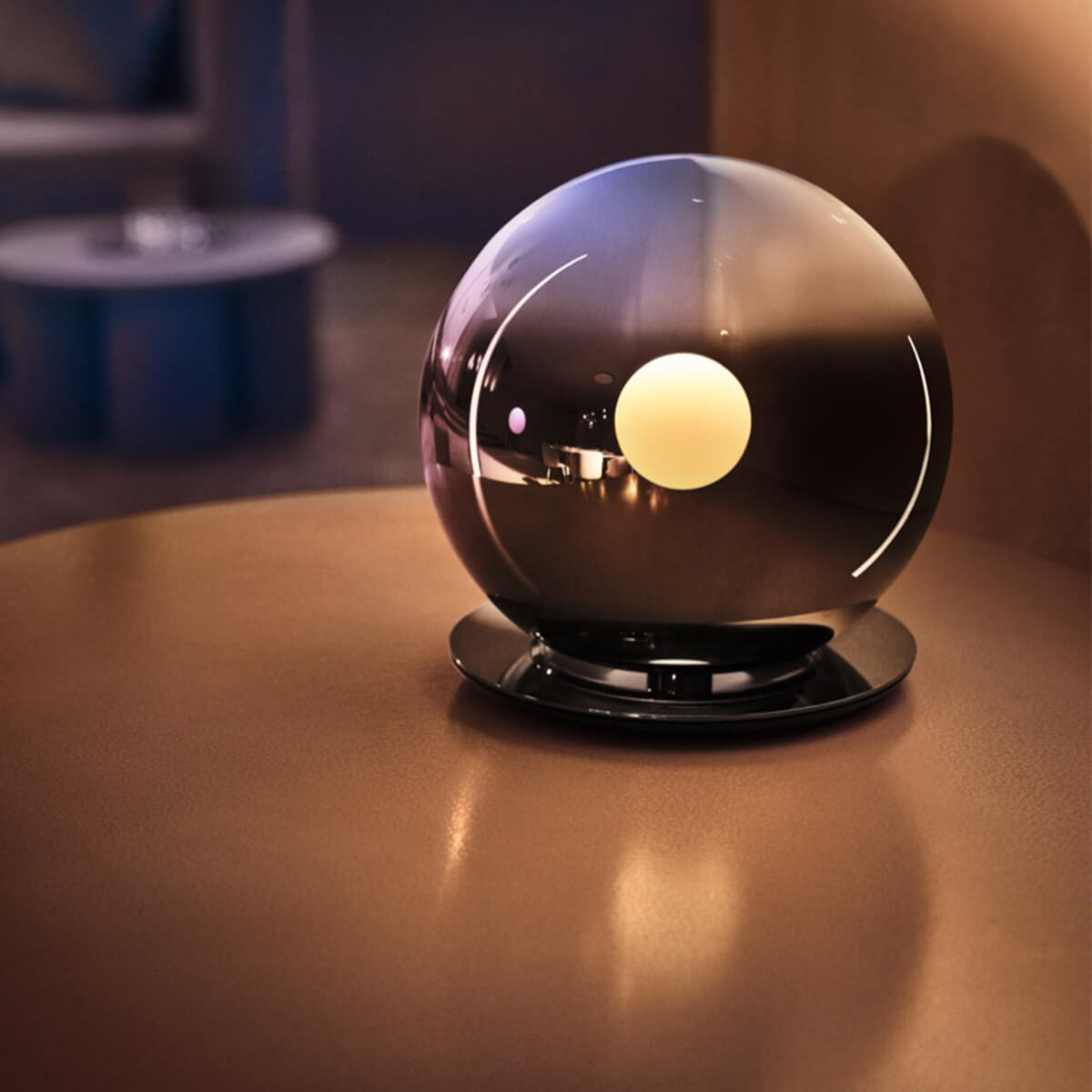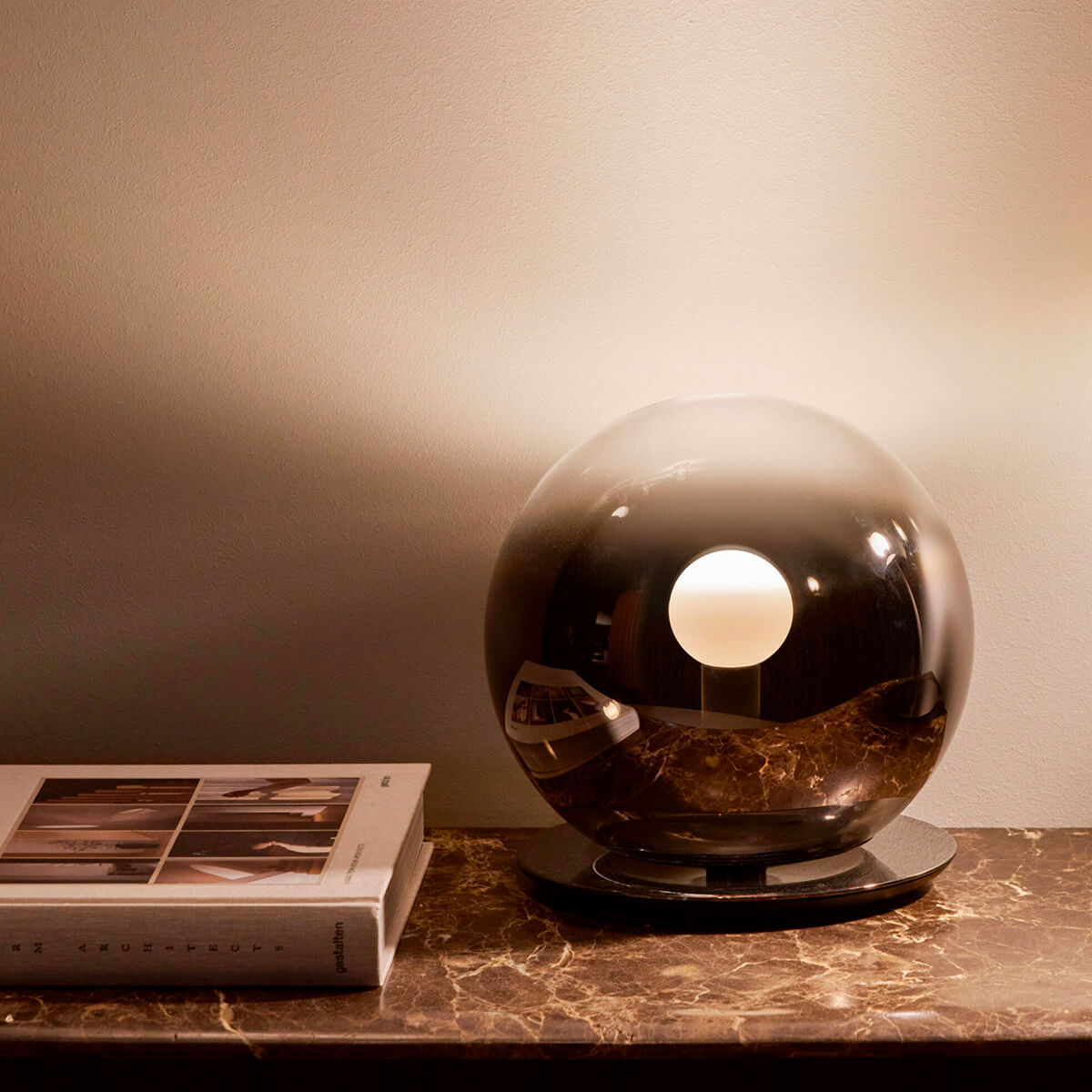 Die bodenverspiegelte Glaskugel in Kombination mit dem Occhio fireball erzeugt eine weiche, indirekte Lichtausstrahlung: Das Licht der Occhio Luna basso Tischleuchte erstrahlt gerichtet nach oben hin und wird zugleich von umgebenden Flächen wie der Zimmerwand reflektiert. Das Ergebnis ist eine faszinierende Lichtatmosphäre, die sowohl im Wohnzimmer, Flur als auch Schlafbereich magische Momente voller Eleganz kreiert.