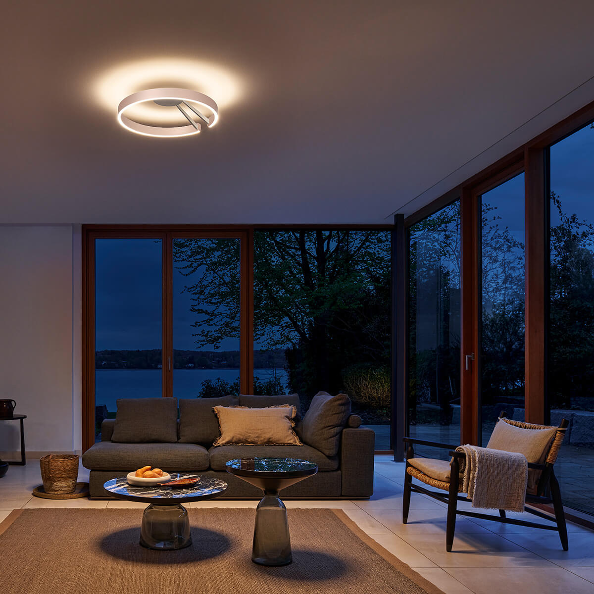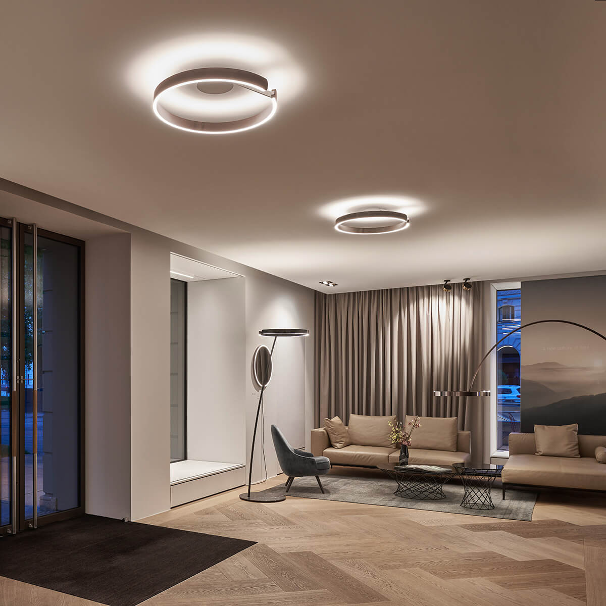 Skulptural, anmutig, ausdrucksstark: Wie ein Ring aus Licht schwebt die Occhio Mito aura 60 wide LED im Raum. Neben ihrer wirkungsvollen Ästhetik überzeugt die Wand- und Deckenleuchte auch mit ihren innovativen Lichtsteuerungsmodi. Ausgestattet mit der Mito set box, kann sie über den Touchlessdimmer am Leuchtenkopf oder via externem Phasenabschnittdimmer geschaltet und gedimmt werden.