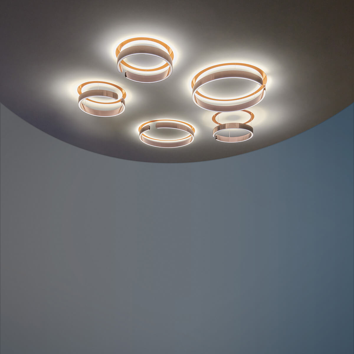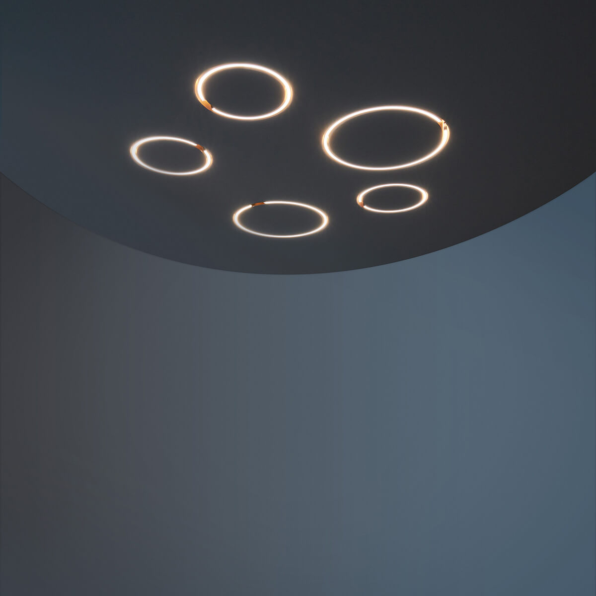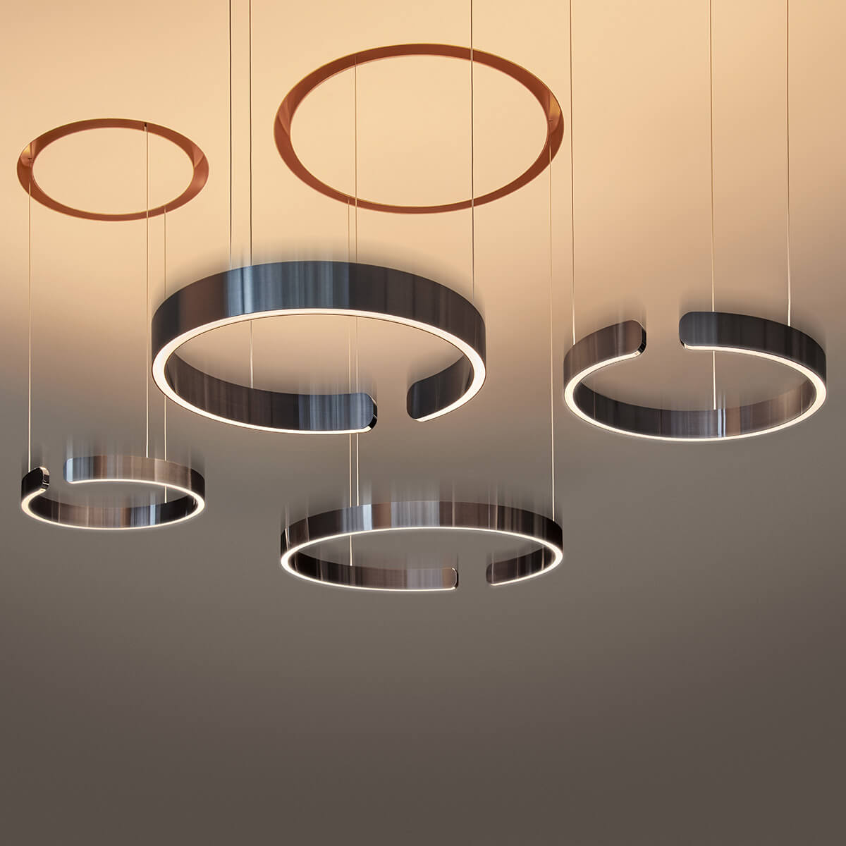 Mittels Einputzelement und weiß mattem light channel lässt sich die Pendellampe deckenbündig in eine Hohlraumdecke montieren. Das Besondere hierbei: Der ringförmige Leuchtenkopf ist vollständig in den light channel einfahrbar, wodurch die Leuchte scheinbar in der Decke verschwindet und einen futuristischen Glow erzeugt – ein geradezu magischer Prozess, der in ein reizvolles Stimmungslicht mündet.