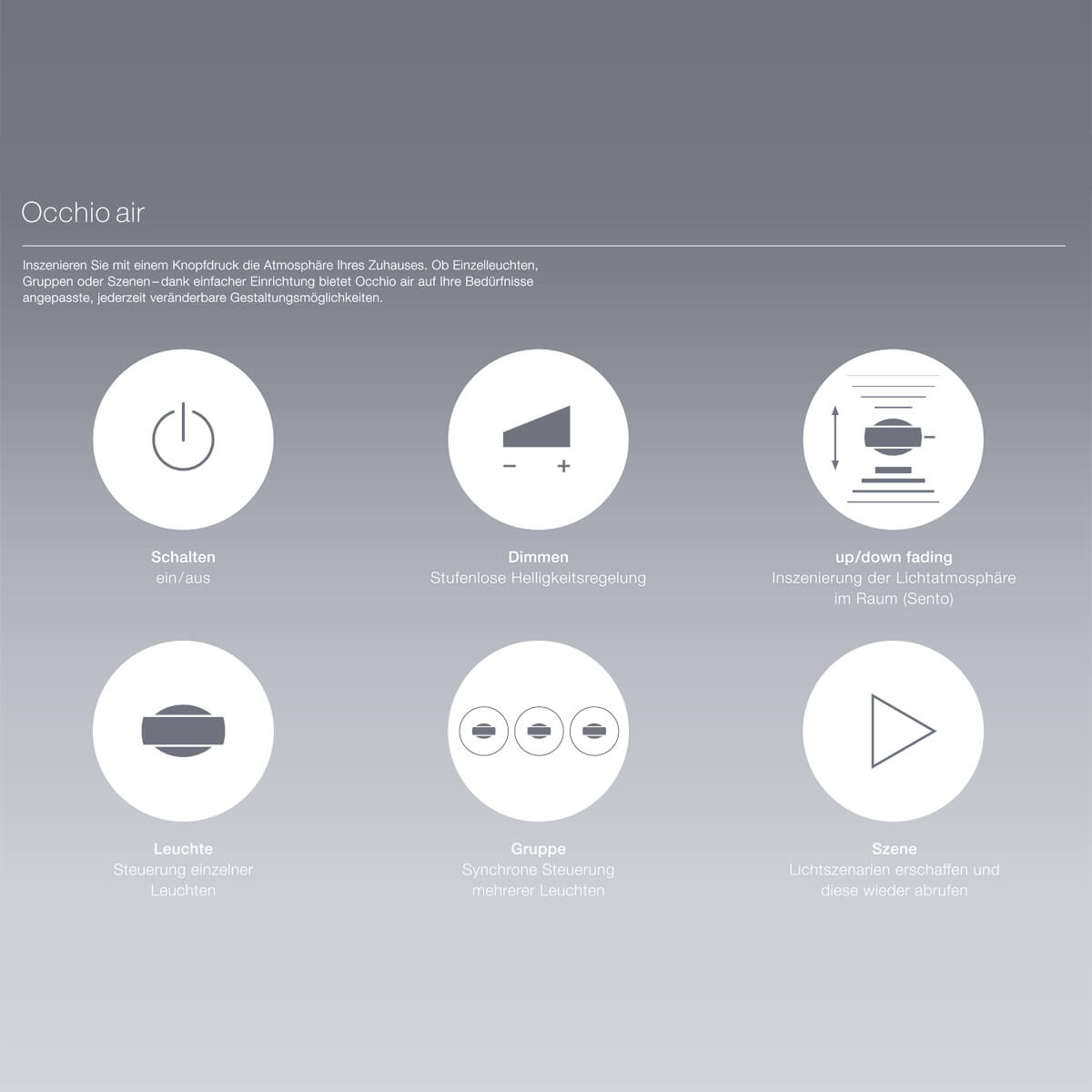 Die kostenlose Occhio air App ermöglicht Ihnen die Steuerung sämtlicher Funktionen bequem vom Handy oder Tablet aus. Zudem können Sie unterschiedliche Lichtszenarien festlegen und situativ abrufen. Dank Occhio air sync lassen sich sogar mehrere Leuchten zu funktionellen Gruppen zusammenschließen – für ein Lichterlebnis von unvergleichlicher Qualität.