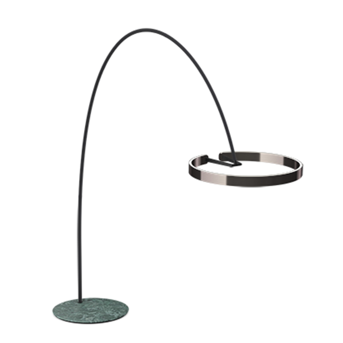 Die Mito largo der Occhio Edizione lusso ist der Luxusliner unter den Bogenleuchten. Ihr solider Sockel besteht aus edlem Marmor, der je nach Ausführung in warmem Braun (Emperador Marmor), markantem Schwarz (Marquina Marmor) oder modischem Grün (Guatemala Marmor) gehalten ist. Der Sockel dient als Gegengewicht zum ausladenden Bogen, der die Leuchte zu einer idealen Lichtquelle über Sofalandschaften und Tischflächen macht.