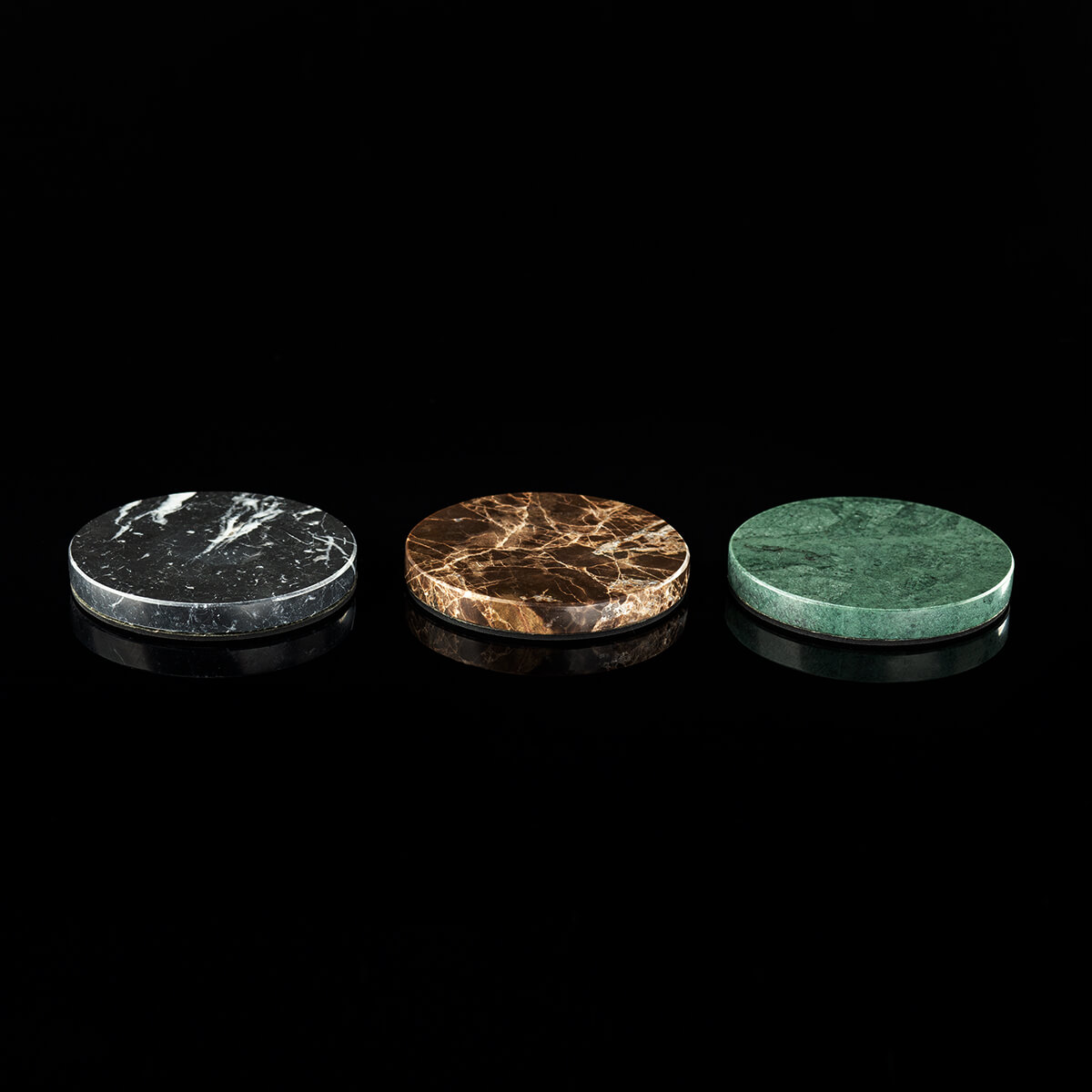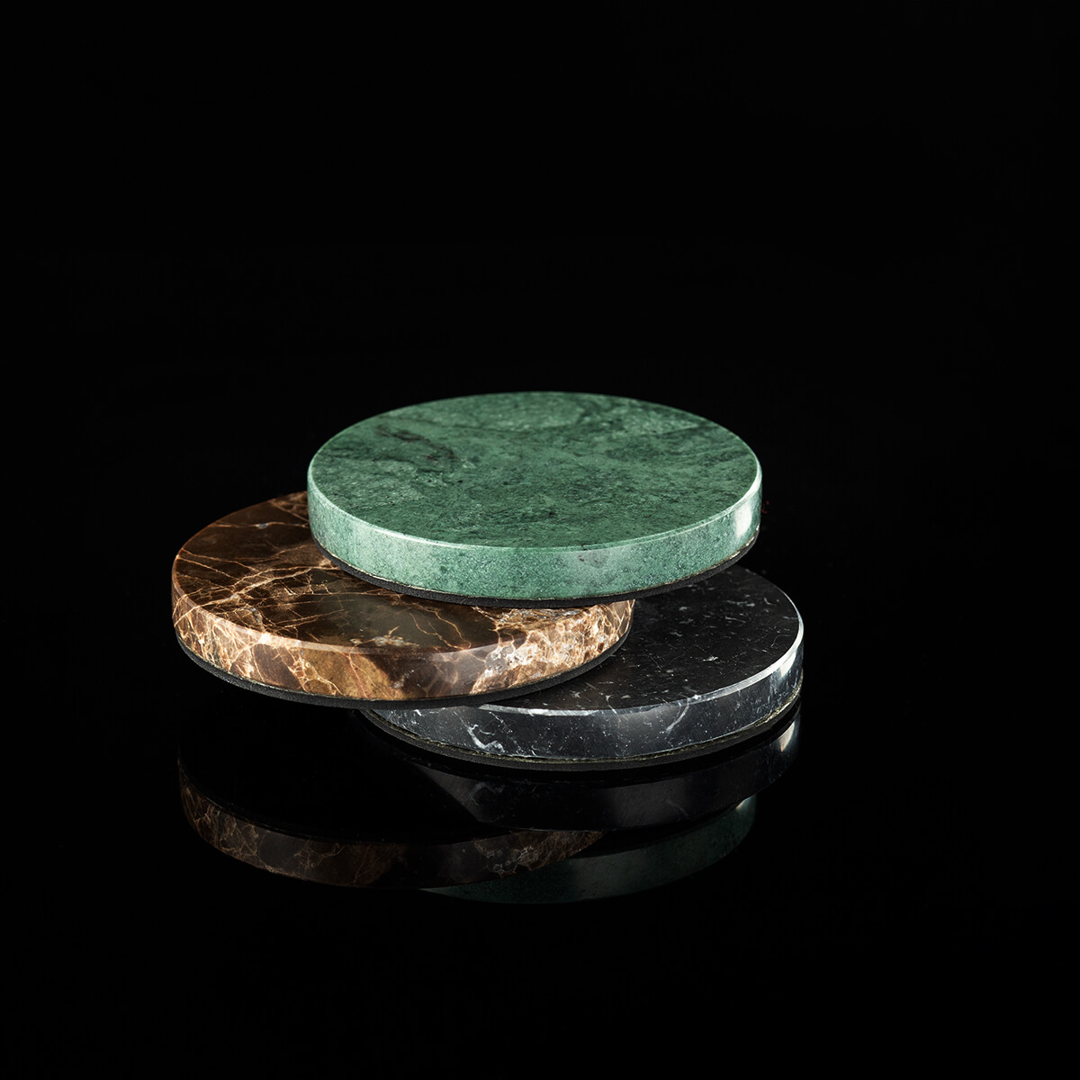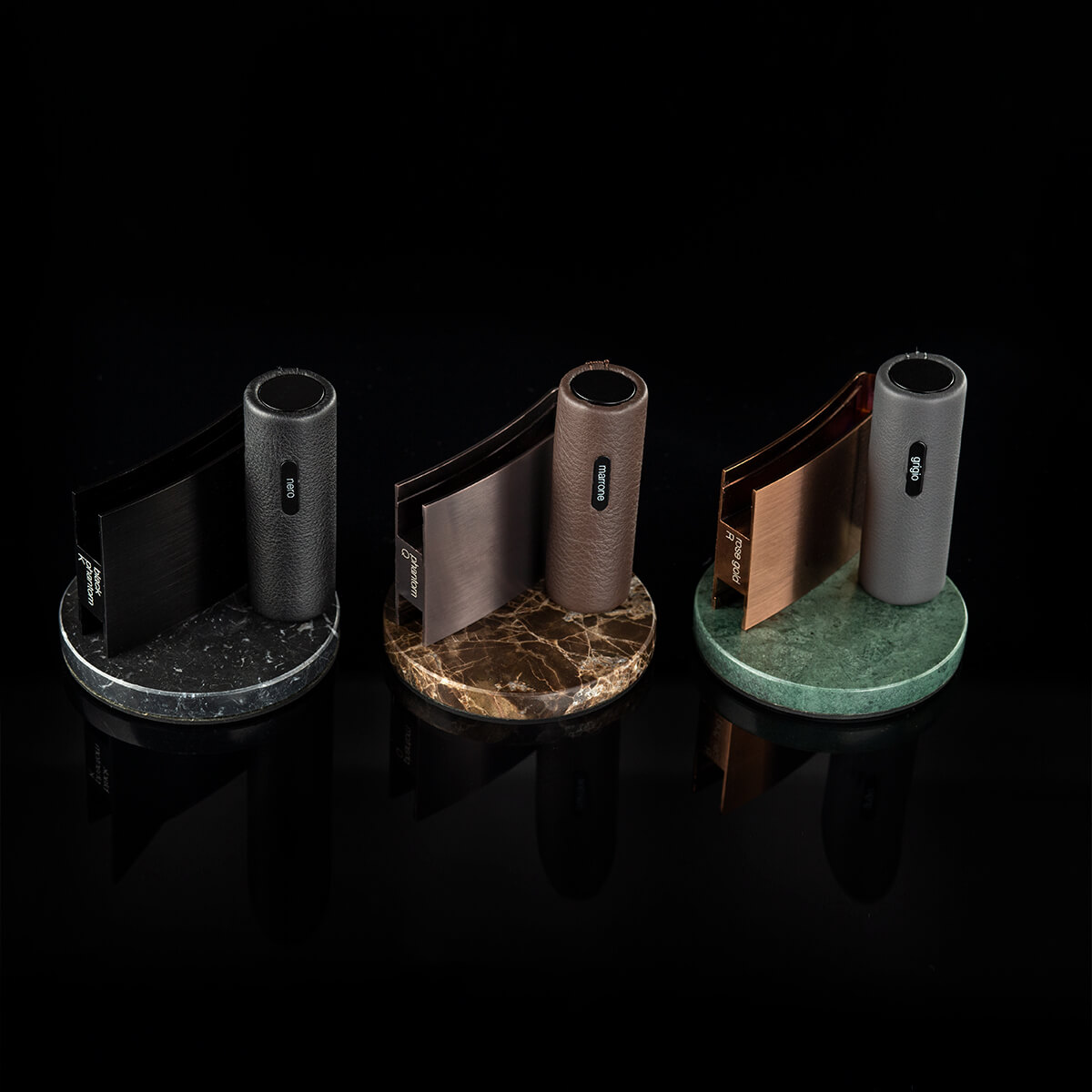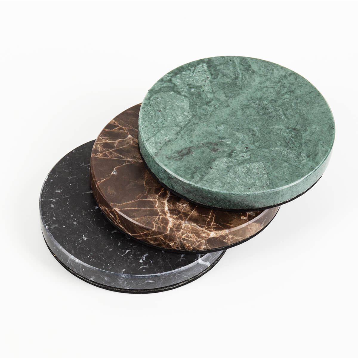 Mit ihren Materialmustern visualisiert die Mito lusso Musterbox die beeindruckende Farbtiefe und sinnliche Haptik der einzelnen Leuchtenelemente. Drei Marmorstücke geben Zeugnis von der Farbwirkung und individuellen Maserung des Marquina, Emperador und Guatemala Marmors. Dieser bildet die Sockel der Mito lusso Bogenleuchten.