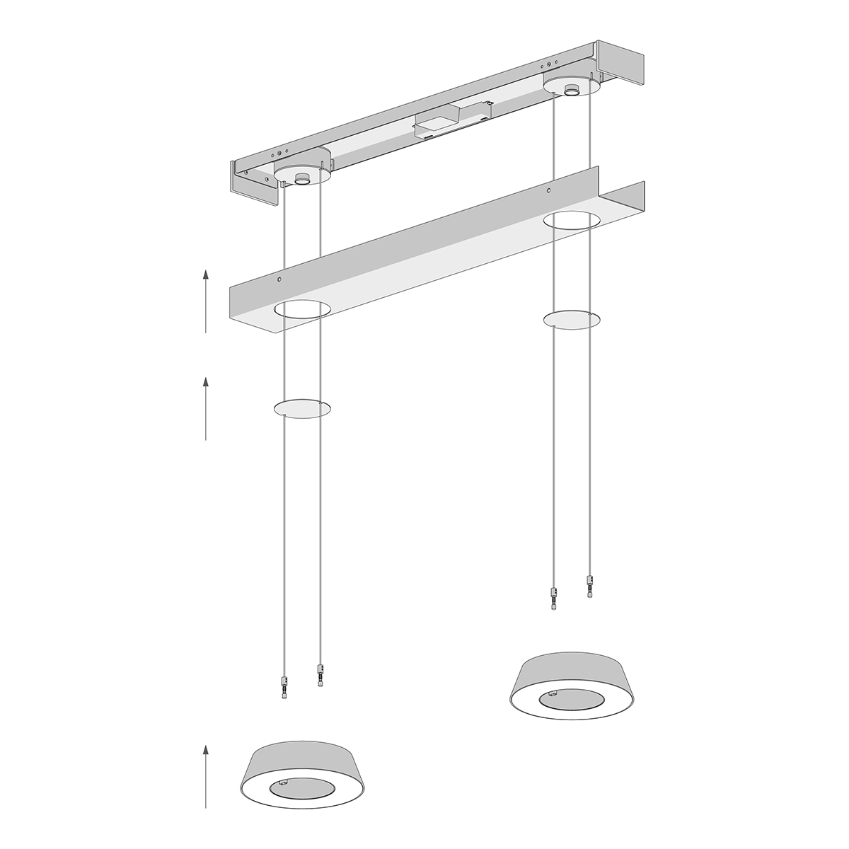 Die unsichtbar höhenverstellbare Glance LED Pendelleuchte ist mit einem mattweißen Baldachin ausgestattet. Auf Anfrage ist auch ein Baldachin mit Abdeckungen in Chrom oder Aluminium gebürstet erhältlich (die schmalen Stirnseiten sind hierbei immer Weiß matt ausgeführt).