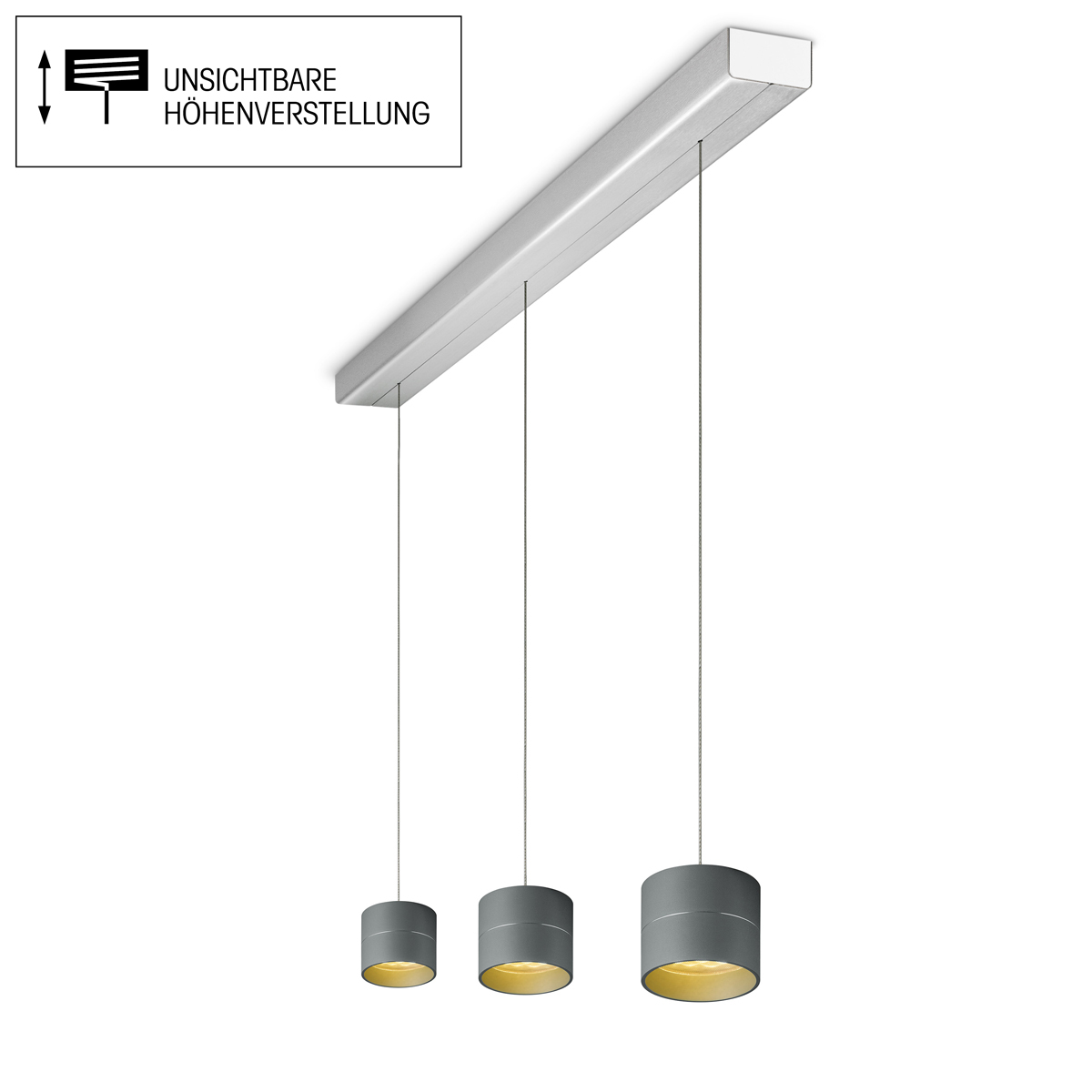 Tudor S LED Pendelleuchte, 3-flg., TW, unsichtbare Höhenverstellung, Baldachin: Alu gebürstet
