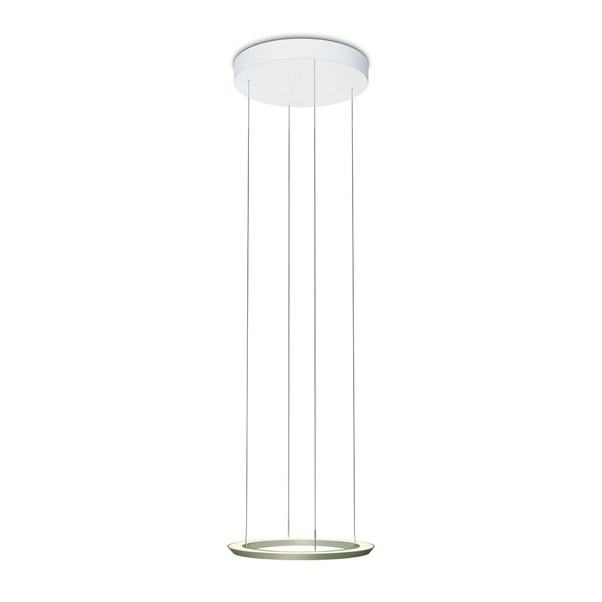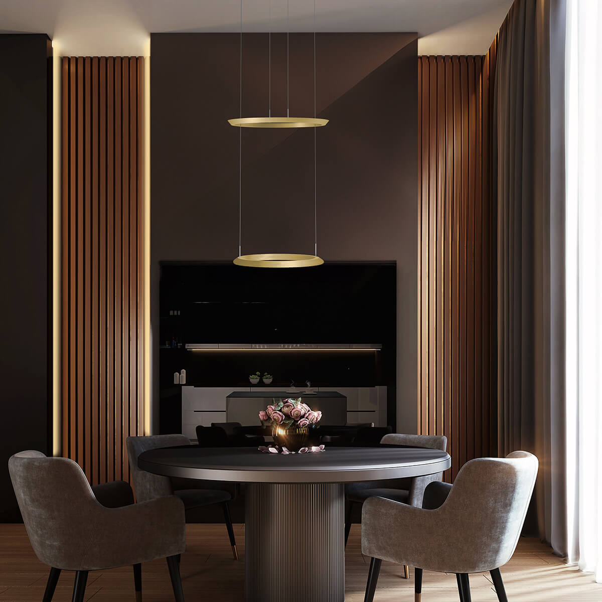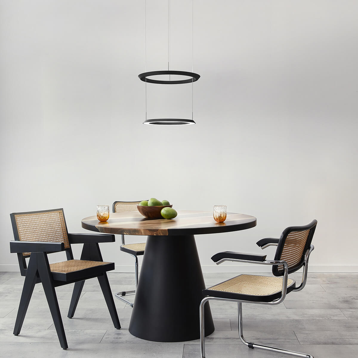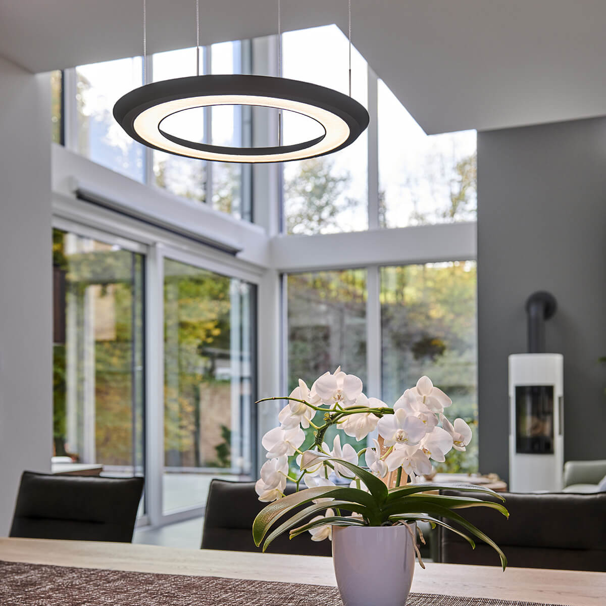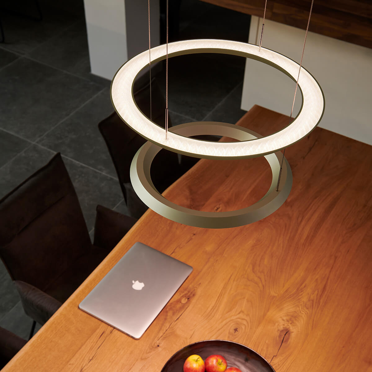 Kennzeichnendes Element der Oligo Pendelleuchte Yano ist der kreisrunde Leuchtenkorpus, der aus zwei abgependelten LED-Ringen besteht. Der obere Ring dient einem indirekten Lichtaustritt, der untere entlässt das Licht nach unten hin. Hierdurch erhellt die Hängelampe unter ihr befindliche Tischflächen und trägt zugleich zu einer indirekten, stimmungsvollen Grundbeleuchtung bei.