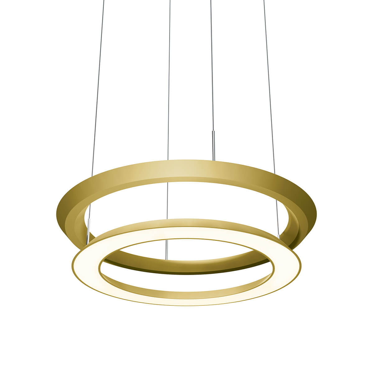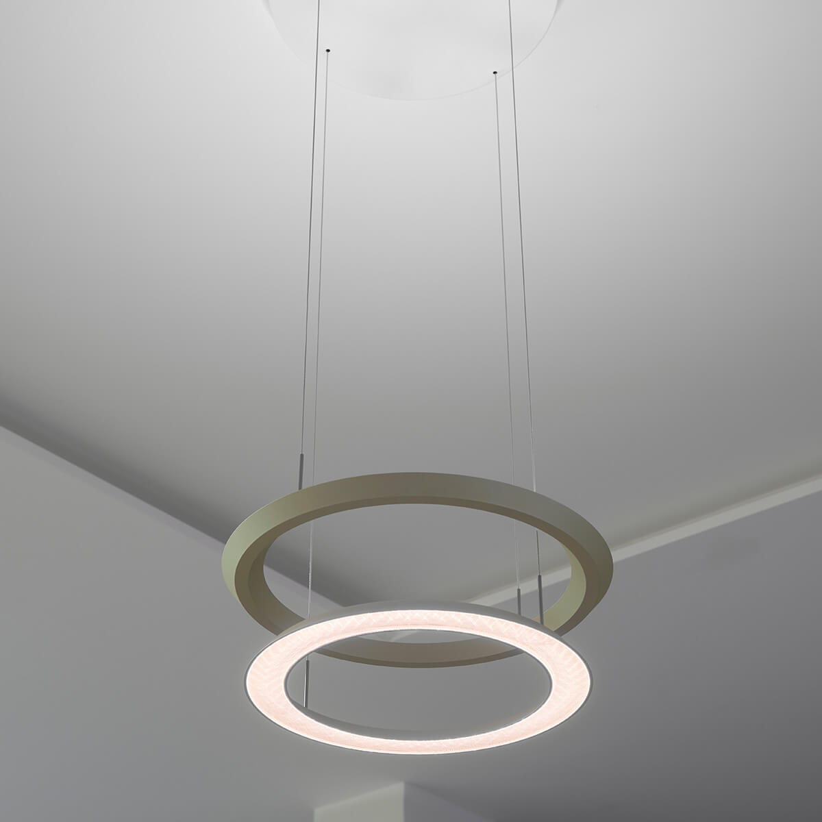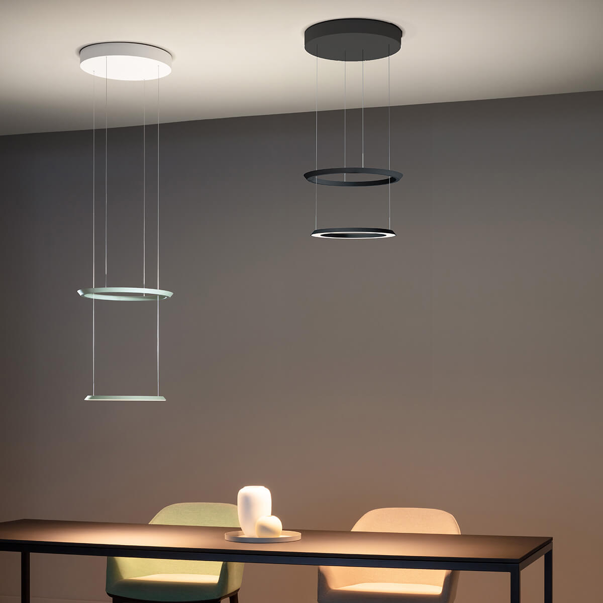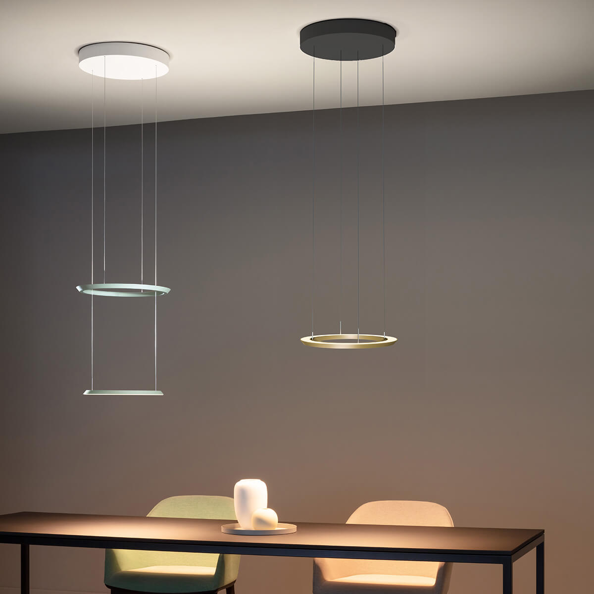 Der besondere Clou: Beide Ringe der Yano lassen sich unabhängig voneinander in ihrer Auszugslänge verändern. Möglich macht dies eine unsichtbar im Baldachin integrierte Seilaufwicklung. Dabei ist der Abstand zwischen den Ringen variabel. In der engsten Einstellung schmiegen sich die Ringe ineinander und verschmelzen zu einer gemeinsamen Form aus Licht. Auseinandergezogen bilden sie ein spannendes Konstrukt im Raum.