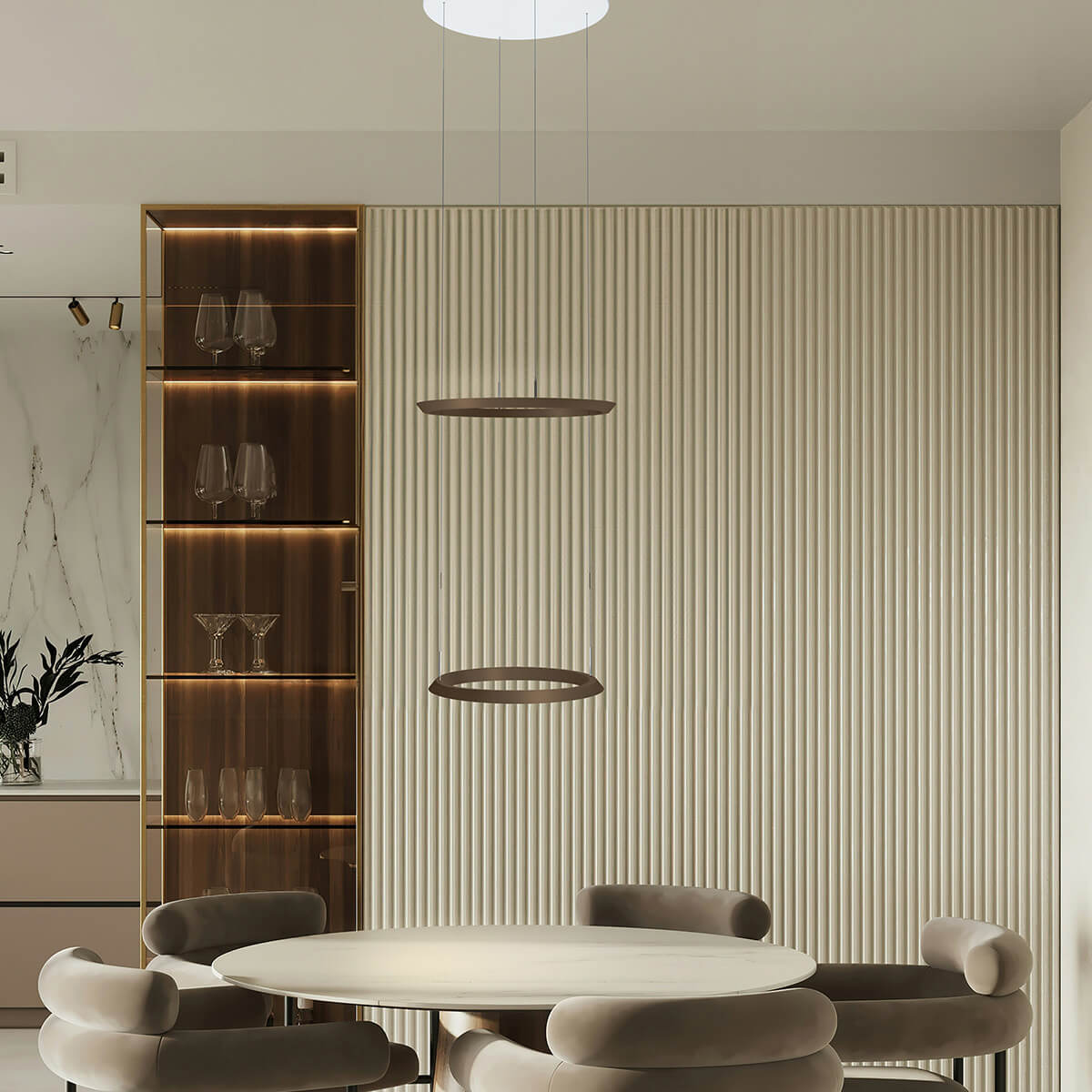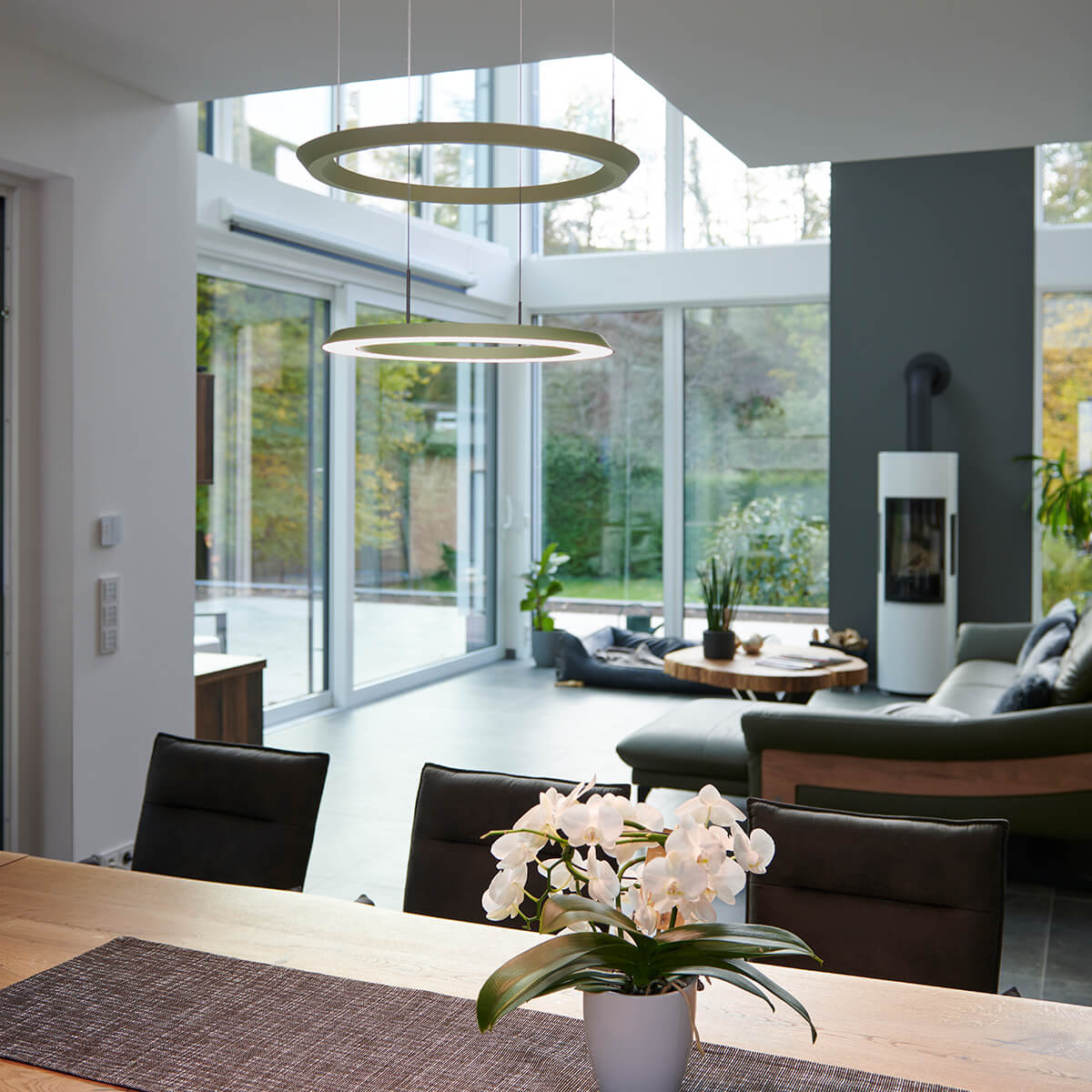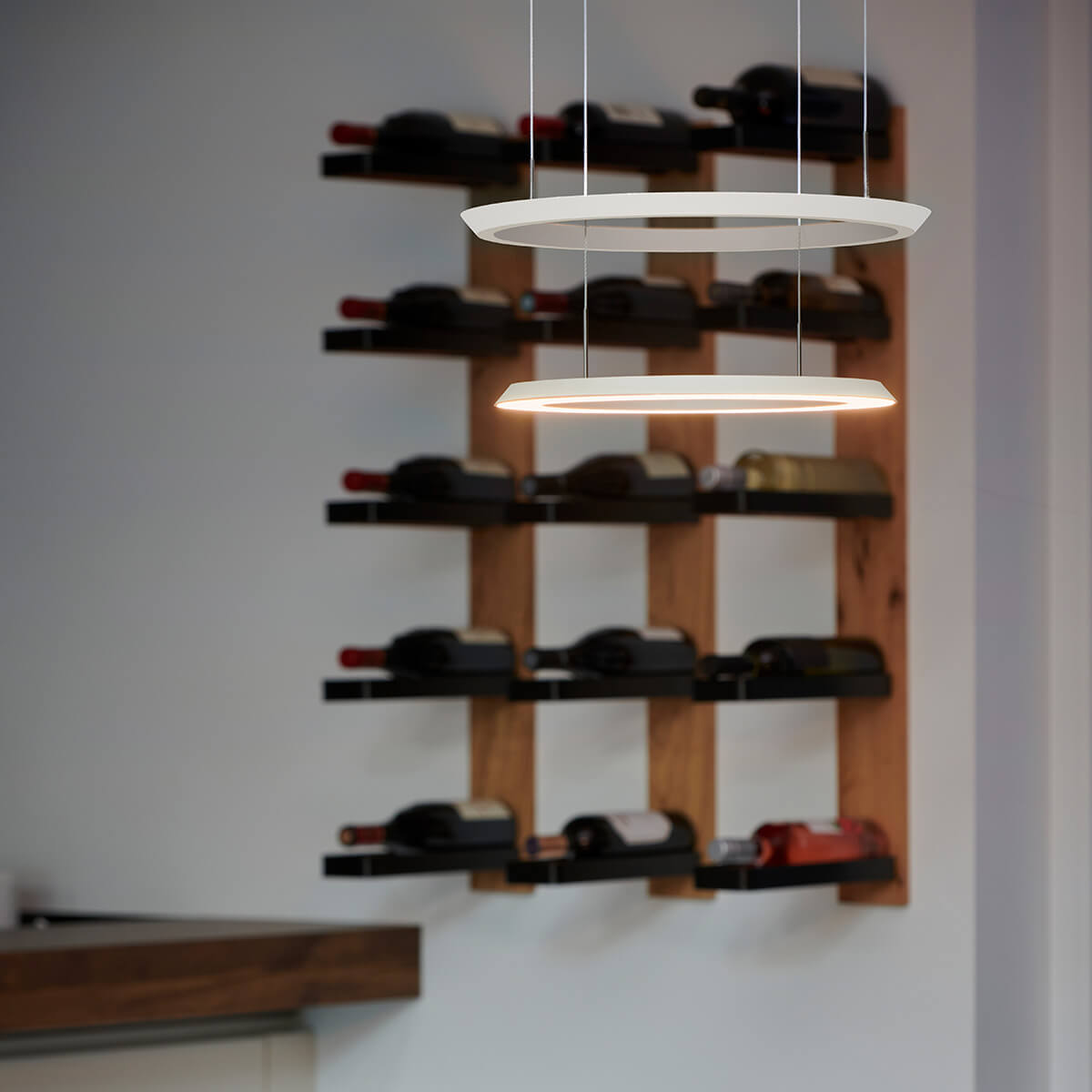 Neben der innovativen Höhenverstellung bietet die Pendelleuchte auch einen besonders hohen Bedienkomfort. Beide LED-Ringe lassen sich berührungslos via Gestensteuerung schalten und dimmen. Noch einfacher gestaltet es sich dank integrierter Smart-Home-Steuerung: Die Lampe ist mit einem Casambi-Modul ausgestattet, sodass die Ringe über die kostenfreie App, getrennt voneinander, bedient werden können.