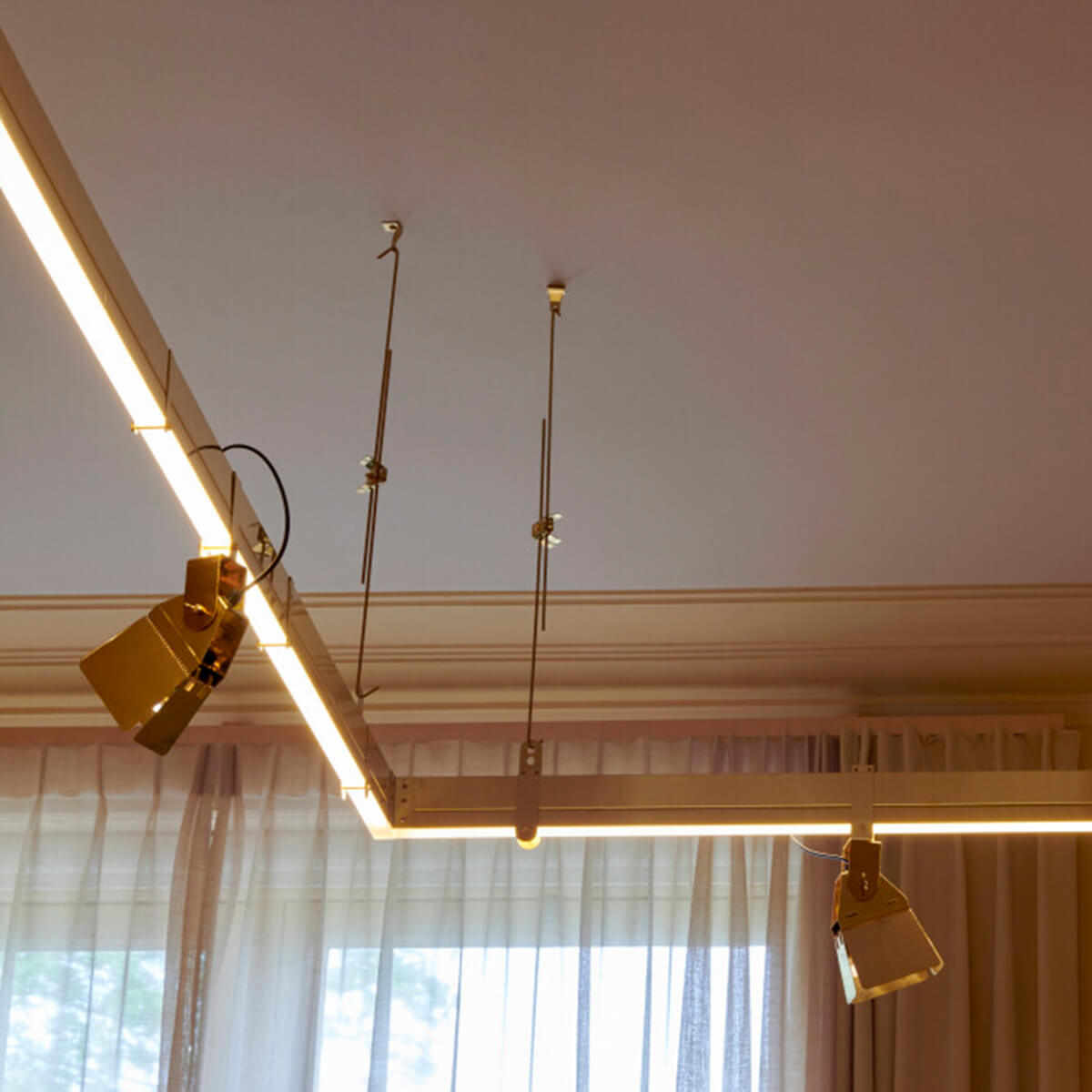 Mit ihrer flachen Rosette ist die Deckenleuchte für die Montage in Hohlraumdosen und abgehängten Decken konzipiert. Dadurch entsteht eine saubere, bündige Lösung, die technisch durchdacht und optisch zurückhaltend wirkt. Vor allem in anspruchsvollen Innenräumen, in denen Lichtplanung und Architektur eng zusammenspielen, ist diese Art der Installation sehr attraktiv. Auf Anfrage sind zudem individuelle Sonderlösungen möglich, etwa als maßgeschneidertes Track-System für projektbezogene Lichtkonzepte.