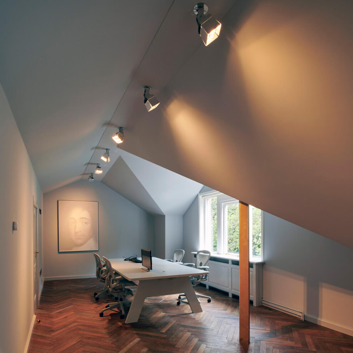 Der justierbare Kopf der Deckenlampe ist ideal, um verschiedene Bereiche im Raum differenziert auszuleuchten. Im Wohnzimmer und Flur können Bilder, Regale oder Möbel akzentuiert werden, in der Küche profitieren Arbeitsflächen und Essbereiche von einer präzisen Beleuchtung. Ebenso überzeugt sie in Showrooms, Boutiquen, Hotels, Lobbys, Museen oder kreativ geplanten Büroräumen, wo Objekte und architektonische Details mit Licht bewusst hervorgehoben werden sollen.