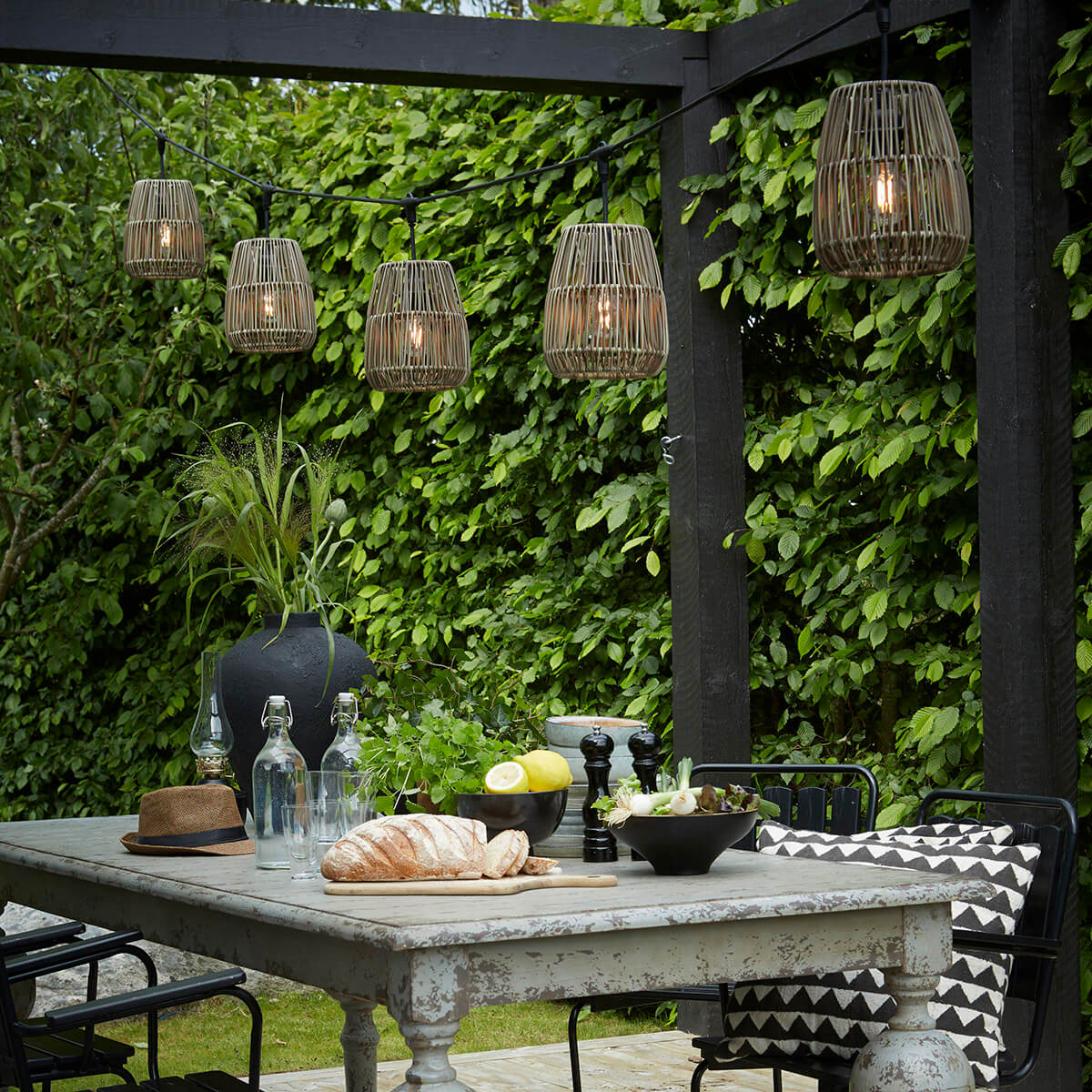 Die Lichterkette ist mit einem 6,5 m langen, schwarzen Kabel ausgestattet, das für den Einsatz im Freien konzipiert worden ist. Es bietet eine großzügige Spannweite: Vom Stecker bis zum ersten Lampenschirm sind es 2,5 m. Die Lampenschirme selbst sind in einem Abstand von 80 cm zueinander angeordnet.