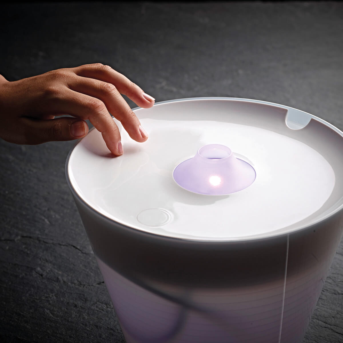 Lichtintensität und Lichtfarbe lassen sich bequem über einen an der Ablagefläche befindlichen Touchdimmer steuern: Ein einfaches Berühren genügt, um das Licht der Rotaliana MultiPot+ LED an die gewünschte Beleuchtungssituation anzupassen.