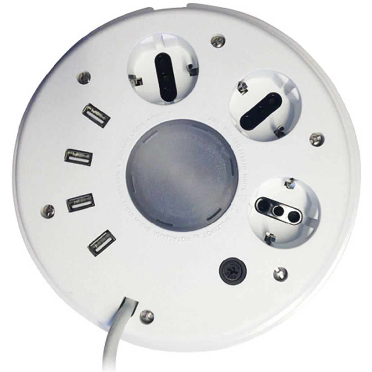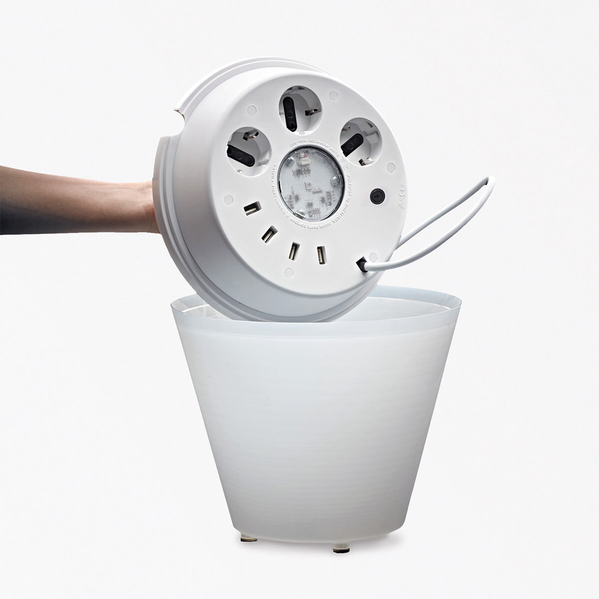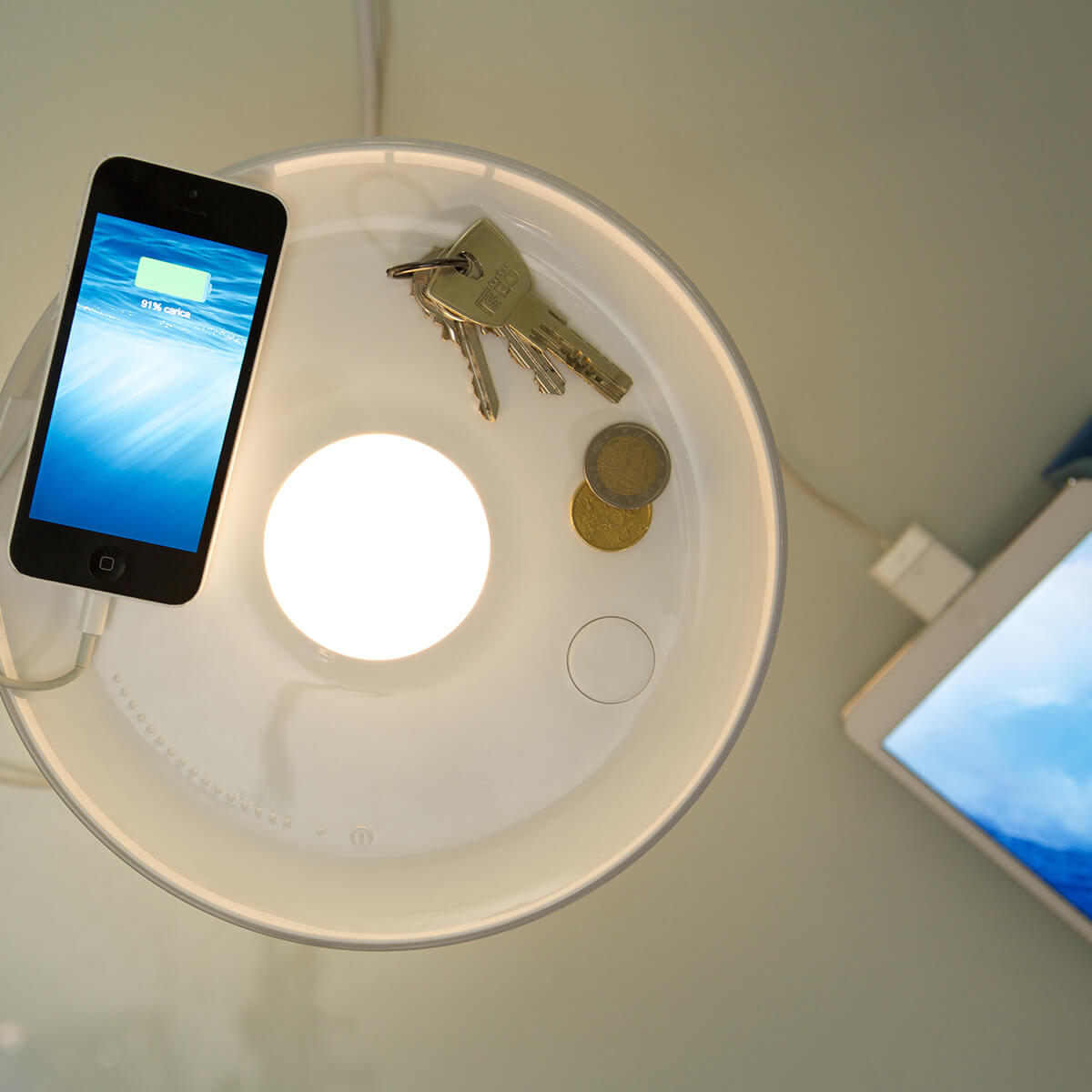 Dieses Konzept hat die MultiPot+ LED Tischlampe übernommen. Die Anzahl der Steckdosen wurde jedoch auf drei reduziert, um Platz zu schaffen für vier zusätzliche USB-Anschlüsse – das wörtliche "Plus" bei der MultiPot+ LED. Zusammen mit dem Mehrfachstecker befinden sich die Ports an der Unterseite des Leuchtendeckels und können dazu genutzt werden, elektronische Geräte wie Smartphones oder Tablets über die Designerlampe aufzuladen. Netzteile und Kabellängen bleiben im Innern der Leuchte verborgen.