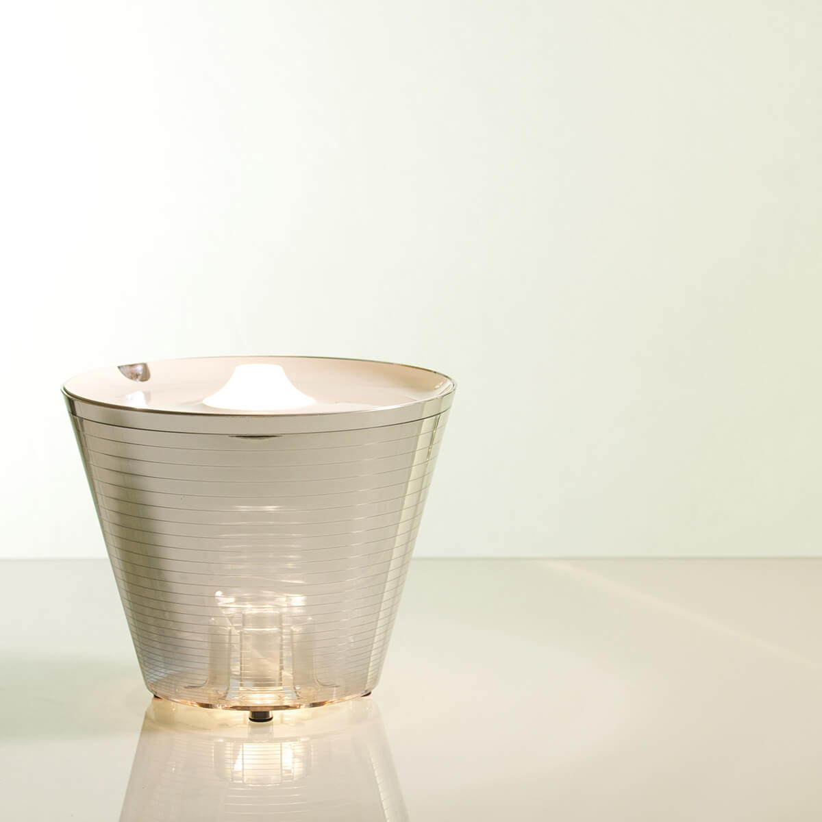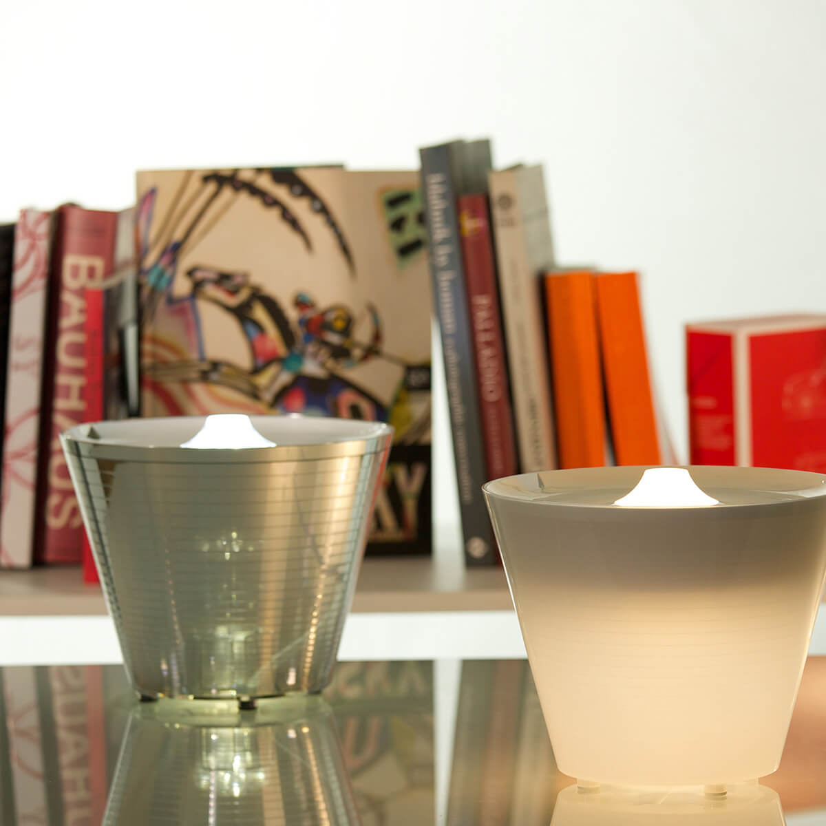 Seine volle suggestive Ausdruckskraft entfaltet das farbige Licht in der weißen Version der MultiPot+ LED. Bei der verchromten Variante hingegen bleibt die diffuse Lichtausstrahlung abgeschirmt, wodurch der Fokus auf der erleuchteten Ablagefläche liegt. Hier ist es die metallische, das Umgebungslicht reflektierende Außenhaut des Leuchtenkörpers, die die Modernität der Lampe unterstreicht.