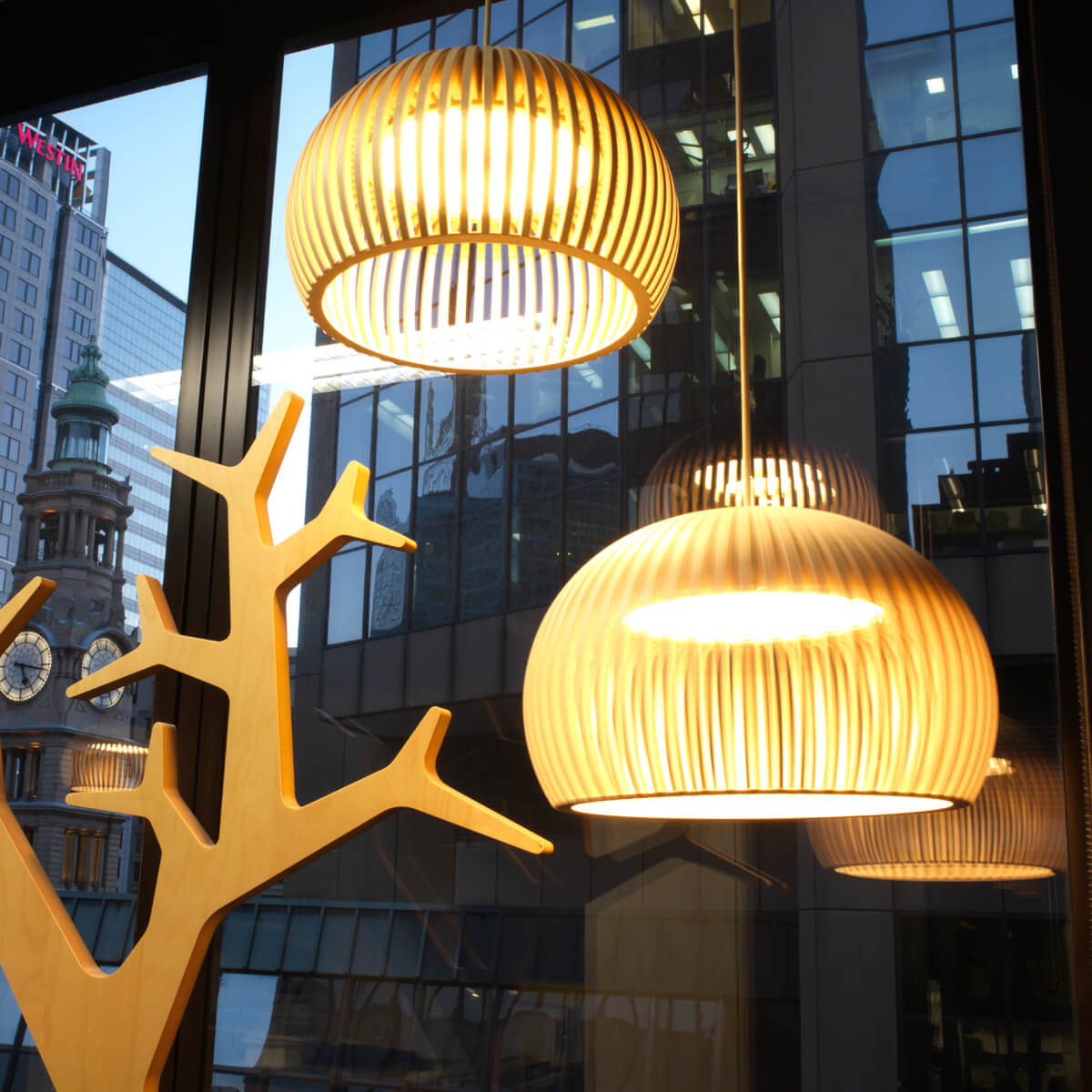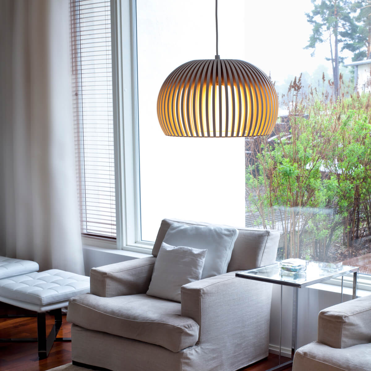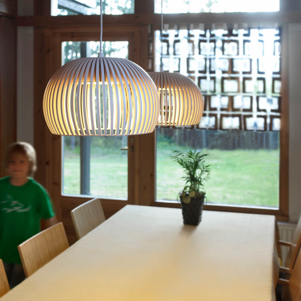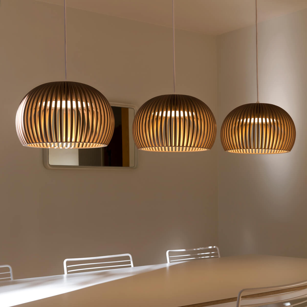 Die kompakte Form der Atto 5000, die sich aus dem Zusammenspiel der feinen Birkenlamellen ergibt, sorgt für einen direkten und atmosphärischen Lichtaustritt. Dies macht die Pendelleuchte zu einer idealen Beleuchtungslösung über Esstischen, Couchtischen und Theken, wo sie nicht nur ein schönes Licht spendet, sondern auch als dekoratives Element ins Auge sticht.