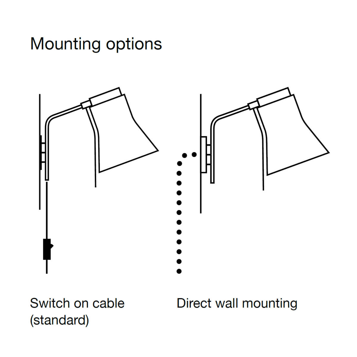 Die Wandlampe wird mit einem Textilkabel samt Schnurschalter geliefert, sodass sie unkompliziert angeschlossen und bedient werden kann. Alternativ ist auf Anfrage eine Variante zum direkten Wandanschluss erhältlich. Um maximale Energieeffizienz und Sicherheit zu gewährleisten, wird die Petite 4630 mit einer passenden LED-Lampe ausgeliefert. Bitte beachten Sie, dass die Verwendung von Halogen-, Spiegel- oder 12-V-Lampen aufgrund von Überhitzungsgefahr nicht gestattet ist.
