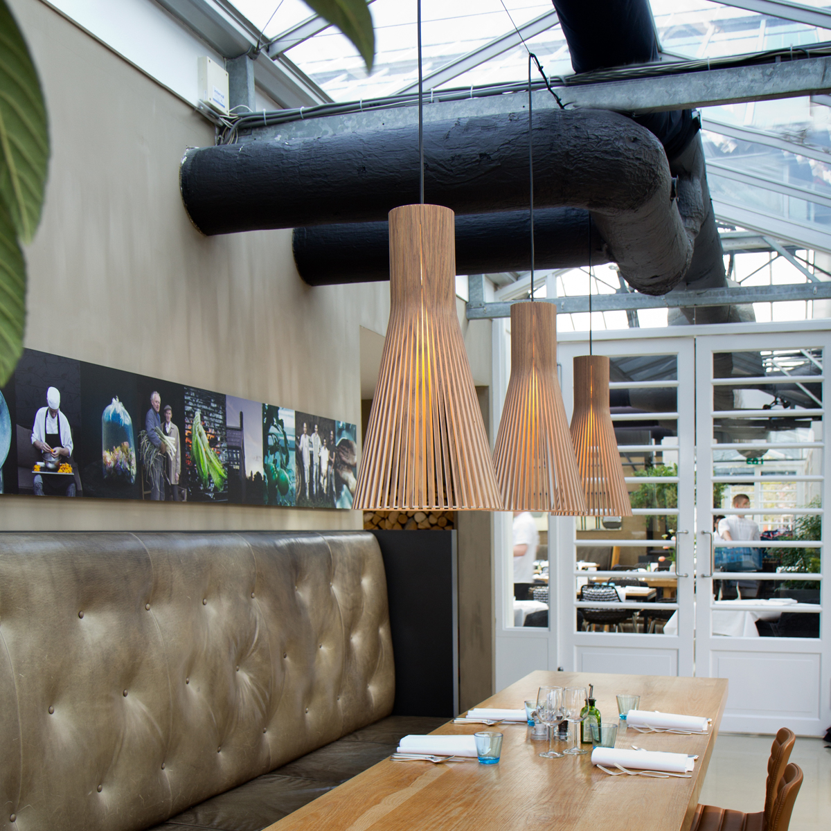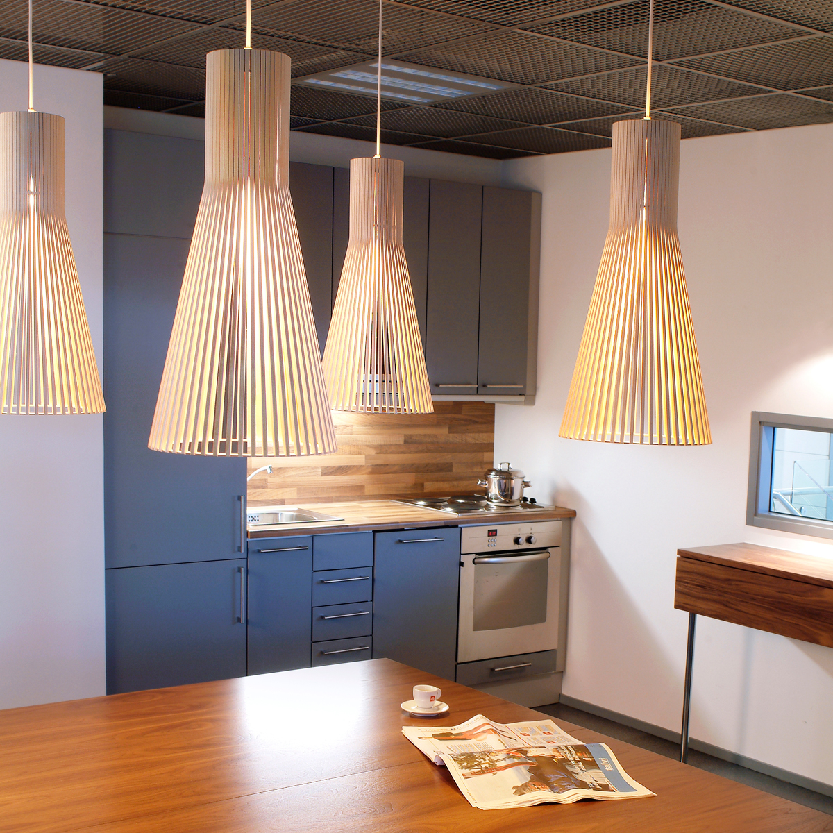Secto Design Octo 4240 Pendelleuchte, Puncto 4203 Pendelleuchte, Secto 4200 Pendelleuchte und Atto 5000 Pendelleuchte, Walnussfurnier