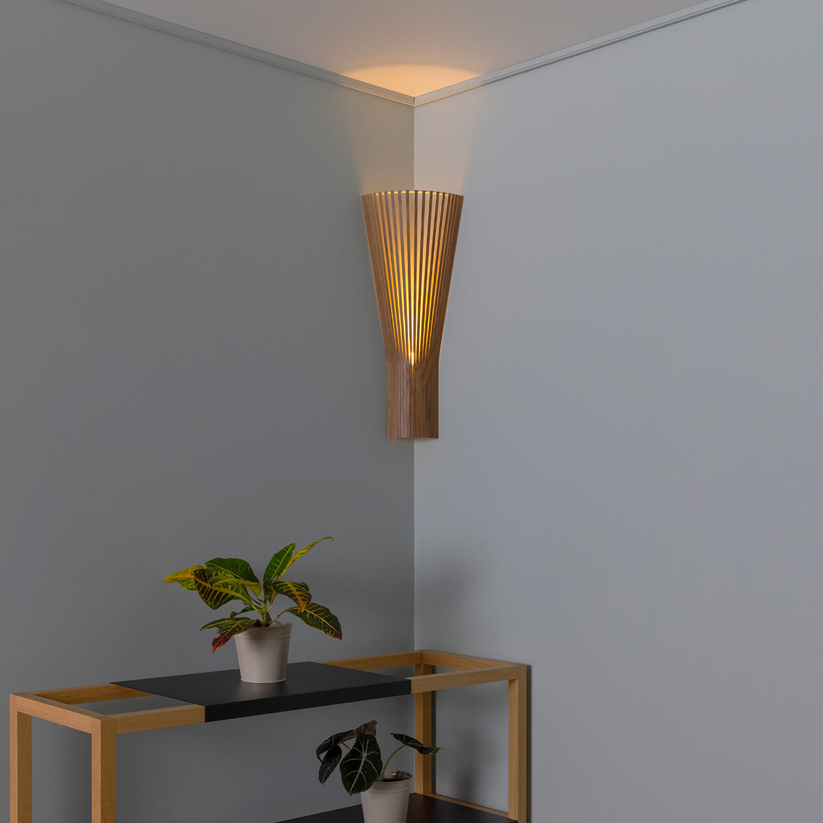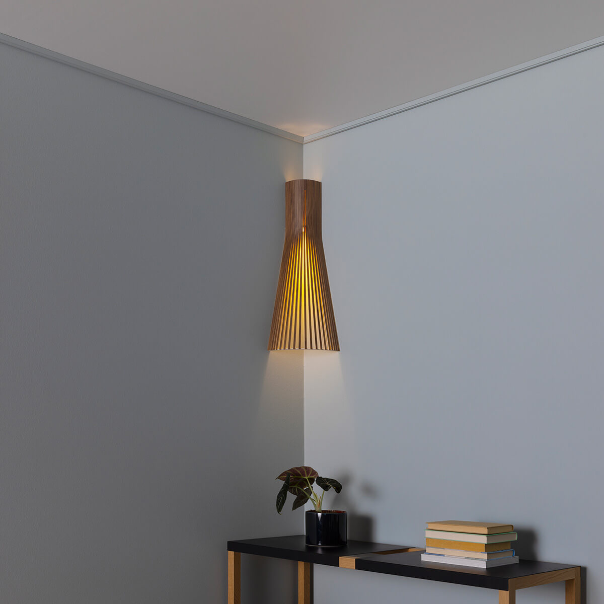 Die Secto 4236 Eck-Wandleuchte ist in verschiedenen wunderschönen Ausführungen erhältlich, darunter Naturbirke, Walnussfurnier oder laminiert in Weiß oder Schwarz. Bedient wird sie standardmäßig über einen Schnurschalter auf dem beigefügten Leuchtenkabel.