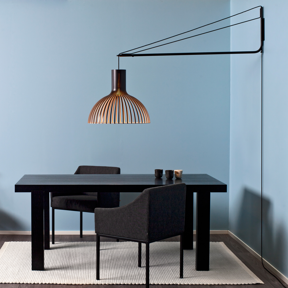 Die Wandhalterung der Varsi 1000 wird mittels vier Schrauben an der Wand befestigt (Schrauben nicht inbegriffen). Bitte beachten Sie bei der Auswahl der Schrauben Aspekte wie Hebelwirkung sowie Material und Stärke der Raumwände. Die gewünschte Pendelhöhe des Victo 4250 Schirms kann über zwei Schrauben am Wandarm justiert werden.