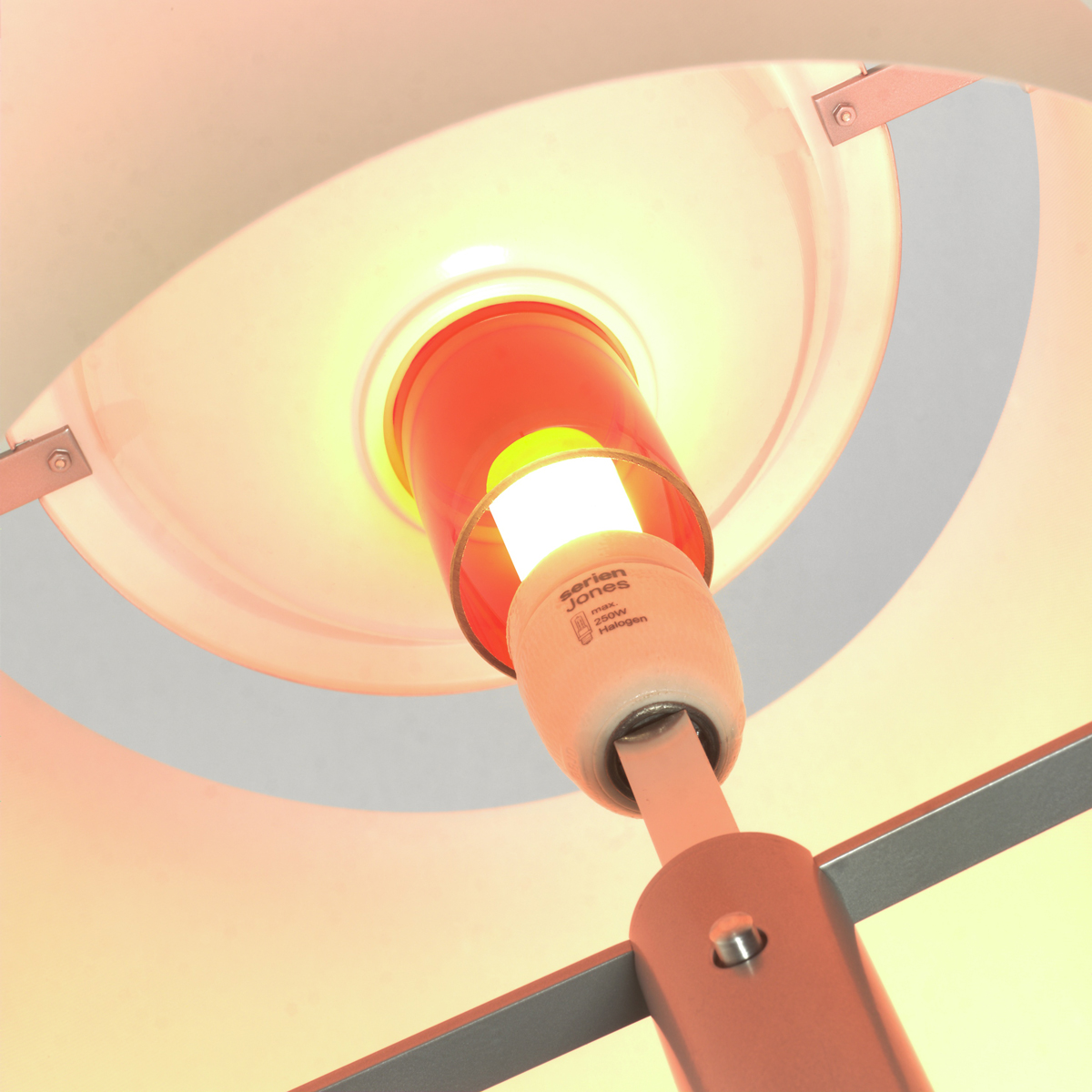 Hierbei ergibt sich je nach Position des Leuchtenschirms eine andersartige Lichtausstrahlung: Schieben Sie das Rohr nach oben, tritt das Licht über die Oberkante aus und die Jones Floor L LED wird zum Deckenfluter. In der mittleren Position strahlt die Lichtquelle diffus durch den Schirm und erschafft, da von einem farbigen Glaszylinder umhüllt, ein orangefarbenes Licht. Verschieben Sie das Rohr nach unten, entlässt die Stehlampe ihr Licht nach unten sowie seitlich gestreut, was sie zur perfekten Leseleuchte macht.