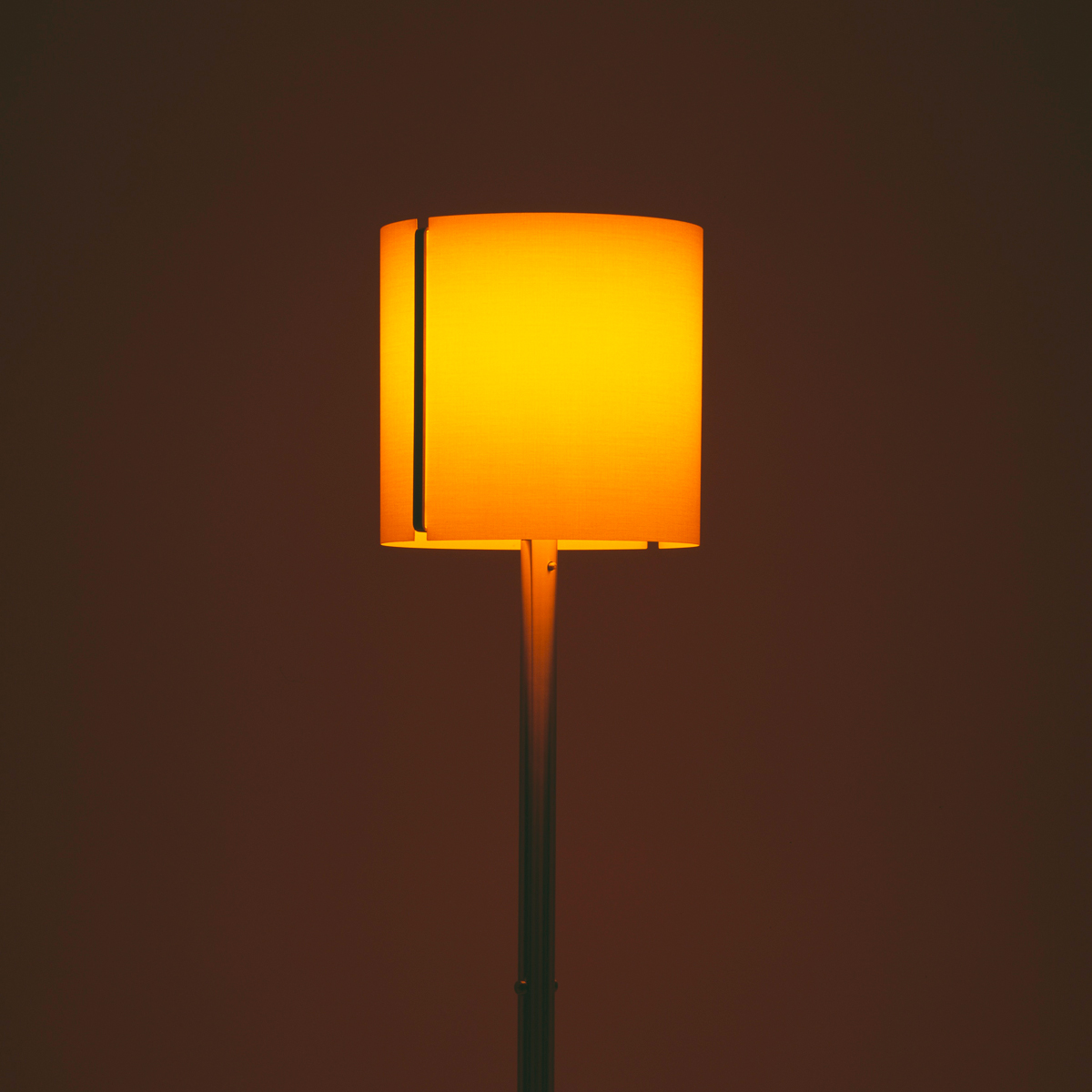 Farbiges Licht erzeugt die Stehlampe aufgrund eines farbig gefassten, leicht austauschbaren Glaszylinders in der Schirmmitte.