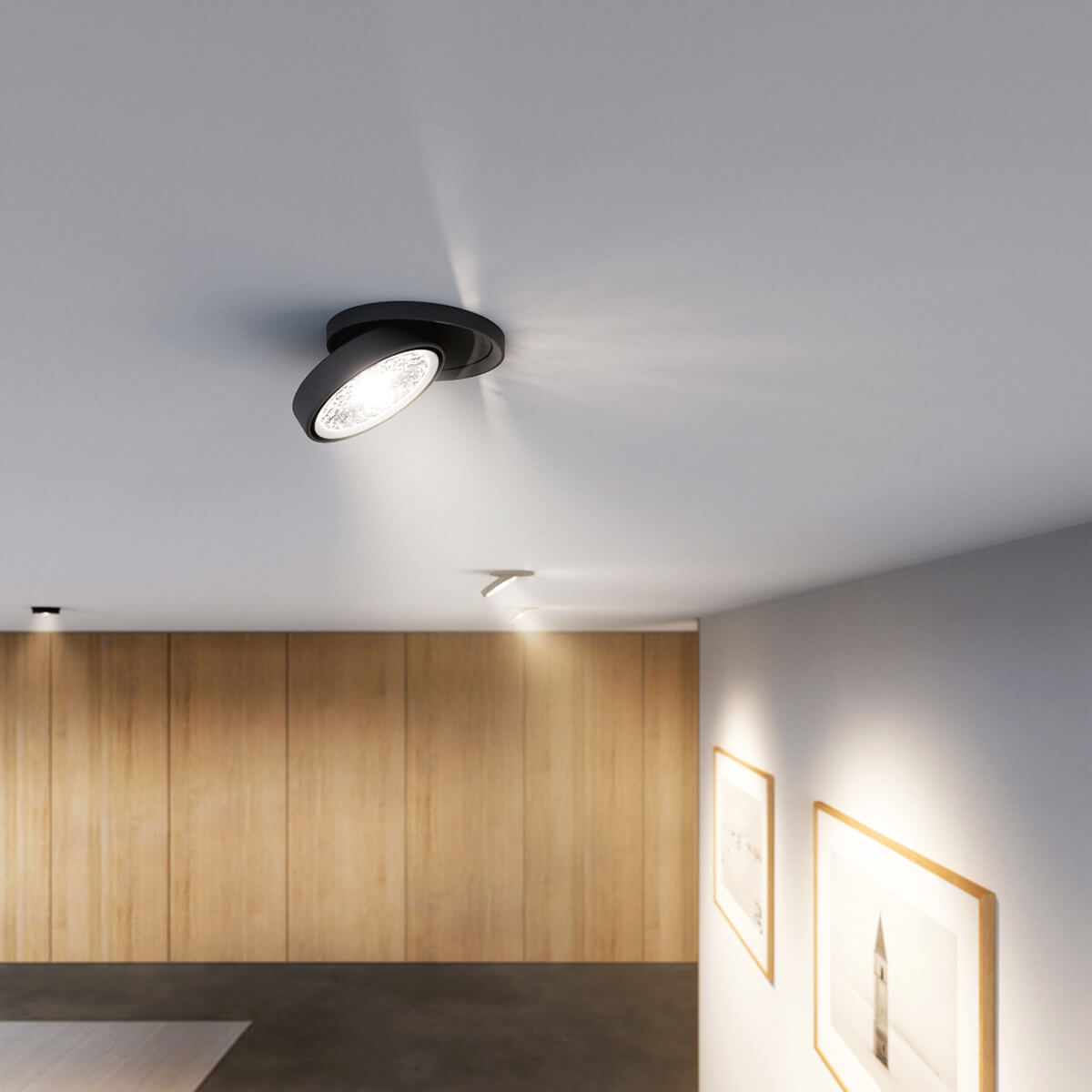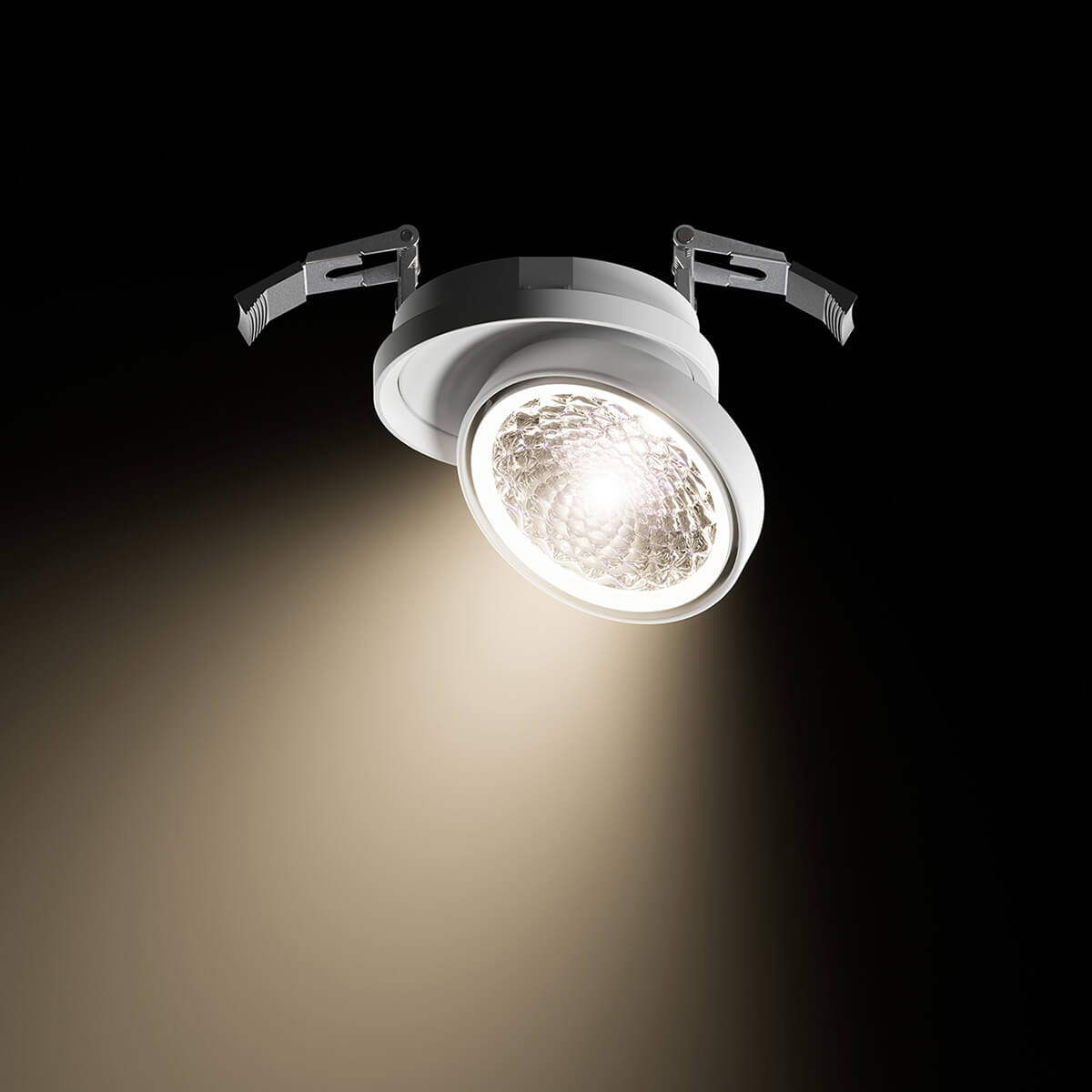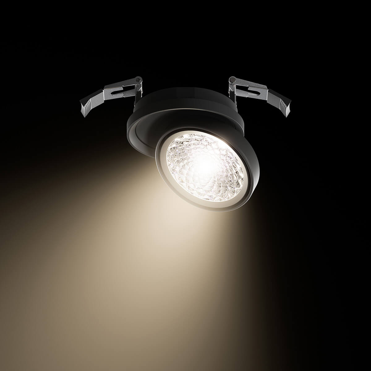 Die Einbau-Deckenleuchte ist in zwei Halbwertswinkeln verfügbar: 36° und 50°. Während der breitere Abstrahlwinkel großflächige Bereiche homogen ausleuchtet, erlaubt der engere Winkel eine gezielte Beleuchtung und schafft definierte Abgrenzungen zwischen hellen und dunklen Zonen. Da das Linsenmodul um bis zu 45° geneigt und um 360° gedreht werden kann, lässt sich der Lichtschwerpunkt präzise ausrichten. Dies macht den Strahler zu einem vielseitigen Werkzeug in jeder professionellen Lichtplanung.