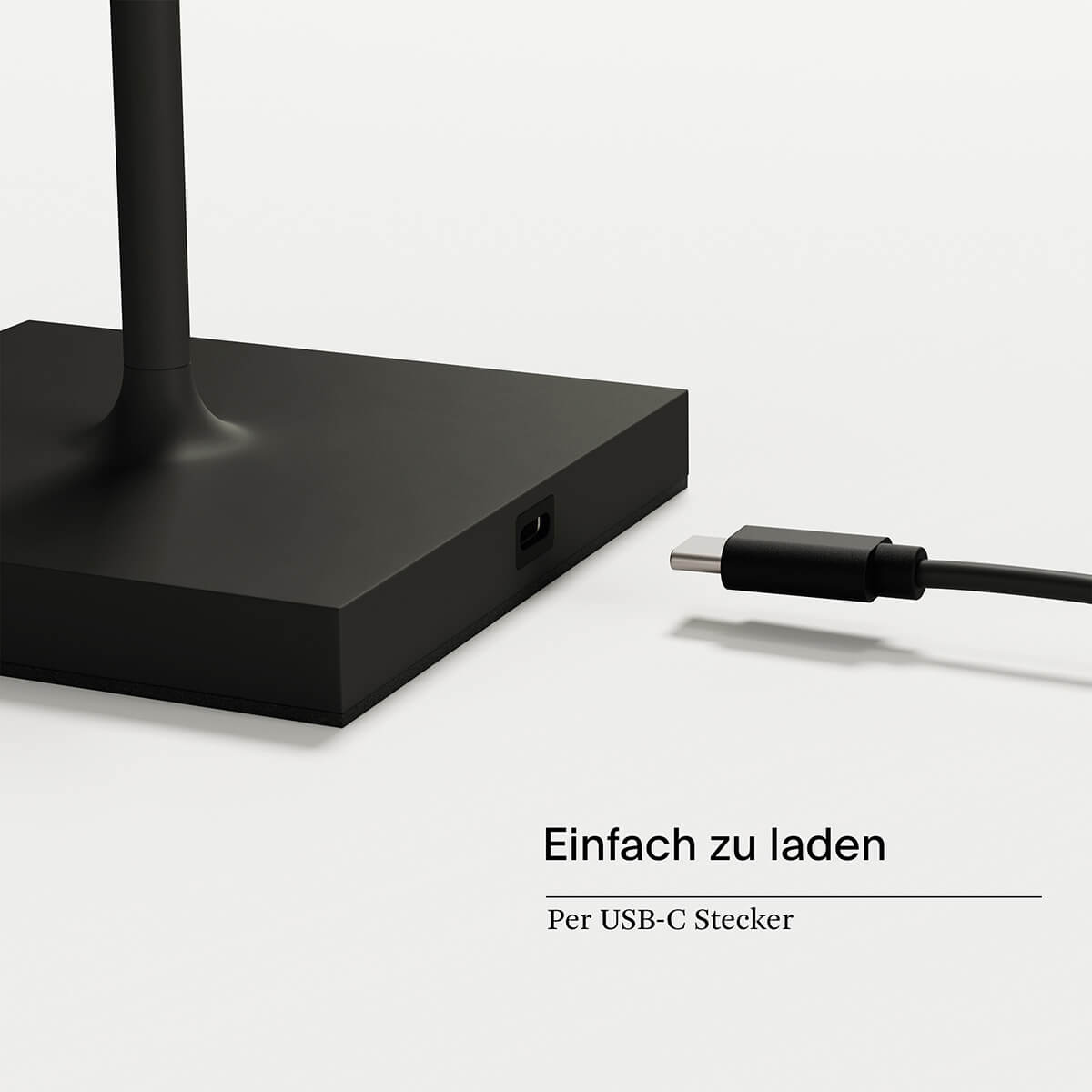 Aufladen lässt sich die Lampe unkompliziert mit dem beiliegenden Netzteil samt USB-C-Kabel (Ladezeit: ca. 5 bis 7 Stunden). Eine volle Ladung gewährleistet bis zu 12 Stunden kabellose Beleuchtung. Dank ihrer matten Soft-Touch-Oberfläche ist die Nuindie tango zudem ein echter Handschmeichler. Hergestellt aus pulverbeschichtetem Aluminium und mit einem Gewicht von etwa 1 Kilogramm verfügt sie über einen stabilen Stand.